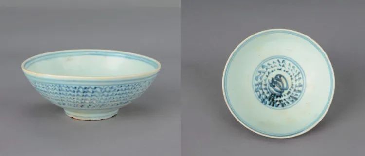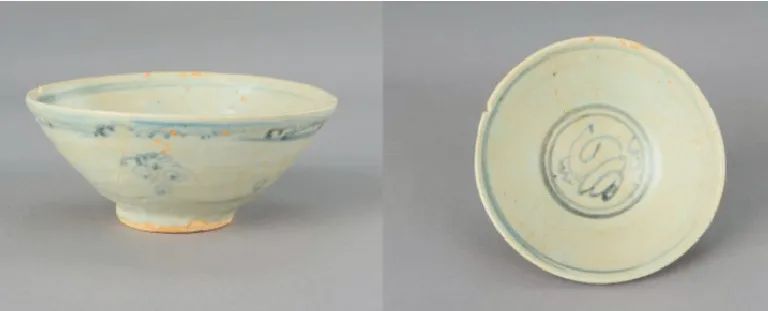 青花瓷碗 1件。M1:3,敞口圆唇,弧壁,平底,圈足。通体施青白釉。口沿与底部内外壁均饰双弦纹,外壁中部及内底绘花草纹。口径13.3、底径5、高5.2厘米(图5:3;图版:3)。