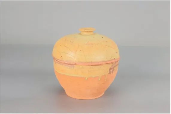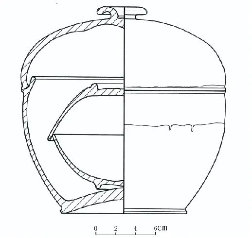 陶坛 3件。形制相近。标本M2:4,覆碗形盖,圆唇,平顶,顶向外延出,以作把手。器身矮胖,敛口、圆唇。肩部两重沿,向上翻卷呈盘状。鼓腹,最大径在上腹部,下腹部斜直内收。腹部饰多道浅粗弦纹,腹部和底部各饰一圈水波纹凸棱。高圈足。灰褐色胎,腹部施青黄釉,有流釉现象。盖口径8.8、顶直径5、器身口径6.4、腹径10、足径9.6、通高16.8厘米(图6:1)。