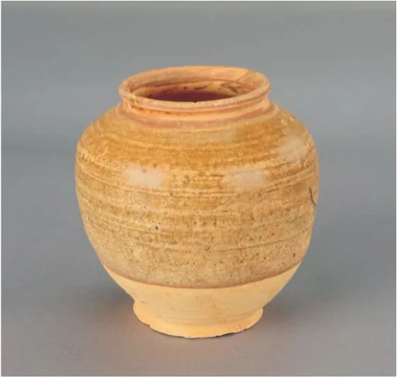 陶罐 1件。M3:2,侈口,尖圆唇,矮颈。圆肩,弧壁下内收。上腹部有多道凸棱弦纹。平底上凹,底部外延。灰白胎,施青黄釉,内壁釉至口沿处,外壁至下腹部。口径6.6、腹径11.3、底径6.2、通高11.5厘米(图8:5;图版7)。