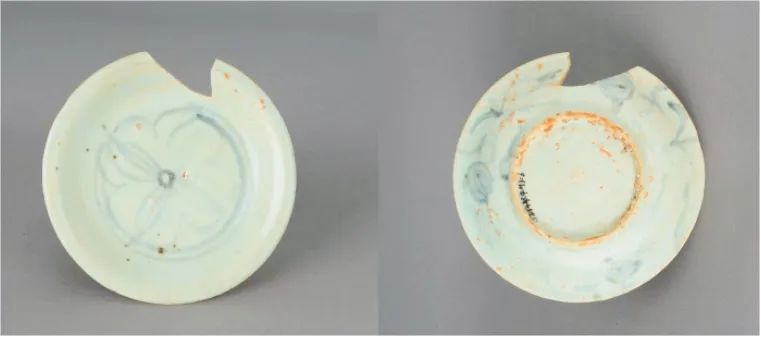 青花瓷盘 1件。M3:6,敞口撇沿,圆唇,弧壁,平底,圈足。施青白釉,足底刮釉,粘有砂粒。外壁绘花草纹,内底绘花瓣纹。口径14、底径7、通高2.5厘米(图8:4;图版12)。出土时扣置于M3:7上。