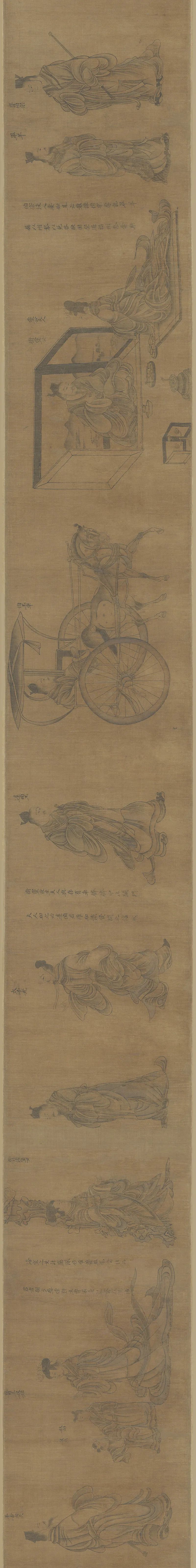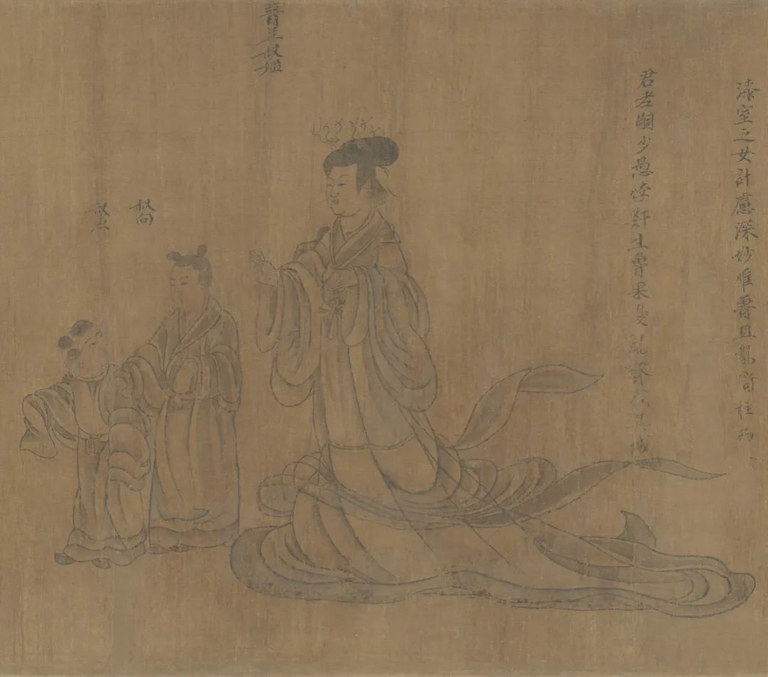 此卷多处保存了汉代的衣冠制度,如男子头戴进贤冠,身着曲线大袖袍,腰结绶带并配挂长剑;女子梳着垂髾髻,身着深衣,特别是眉毛涂以朱色,是模仿赵昭仪的新妆,这些都表现了特定时期的风俗和时尚。又蘧伯玉所乘坐的马车称 “轺车”,亦为汉代形制,描绘得非常细致而无错误,这些都可以从大量出土的汉代画像石、砖和壁画中找到与之相应的图象。此为宋人摹本,绢本墨笔淡着色,旧传东晋顾恺作。该画是清宫旧藏,经《庚子销夏记》、《石渠宝笈初编》等书著录。后由溥仪携出,旋入长春伪宫,1953年连同已佚散的历代名贵书画百余件回到故宫博物院。