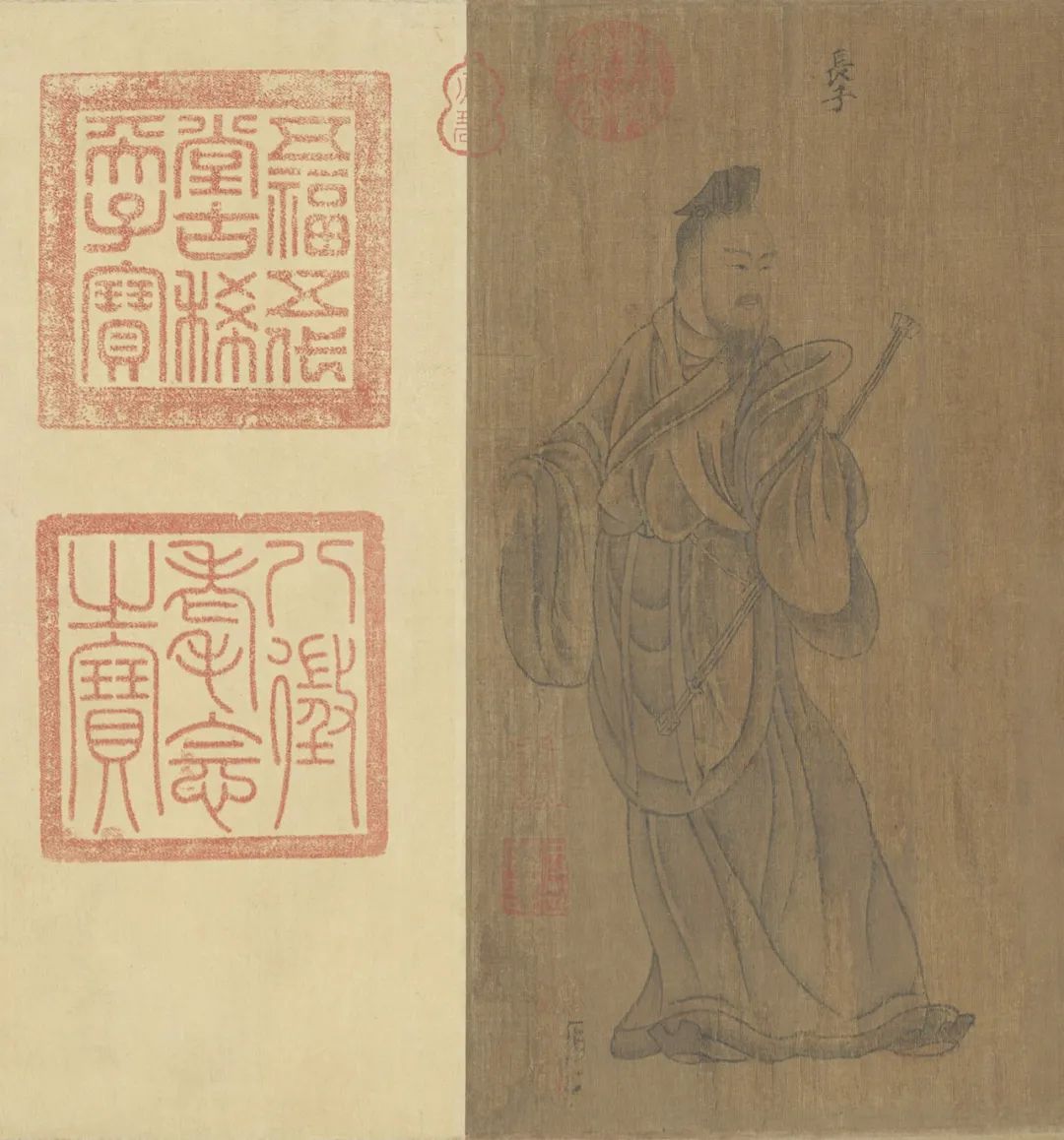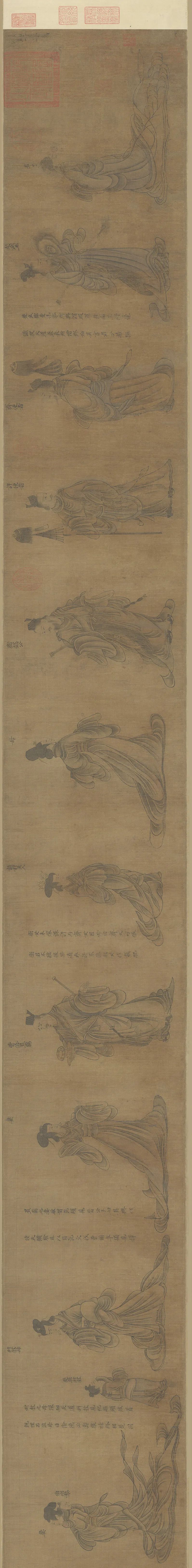 仁智卷共收集15个列女故事。此卷为残本,画面现存十段共二十八人,每段上还书有人名及颂辞。其中 “楚武邓曼”、“许穆夫人”、“曹僖氏妻”、“孙叔敖母”、“晋伯宗妻”、“灵公夫人”、“晋羊叔姬”7 个故事保存完整。“齐灵仲子”、“晋范氏母”、“鲁漆室女”3 个故事只存一半,其余 5 个故事则全丢失,又错将 “鲁漆室女” 之右半与 “晋范氏母” 之左半拼接在一起,使人误以为是一个故事。卷后有元代新安汪注,明代叶隆礼等四家题记。卷前有清收藏家染清标书签。钤元乔臾成、王芝,清梁清标、王鹏翀及乾隆内府诸鉴藏印。
