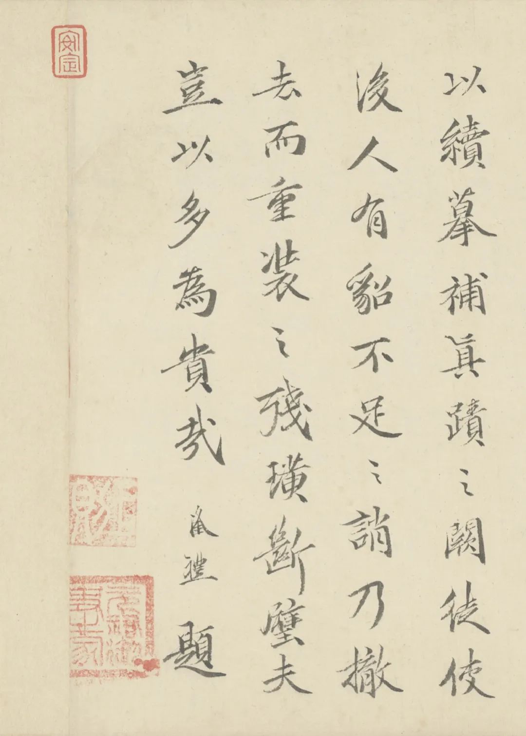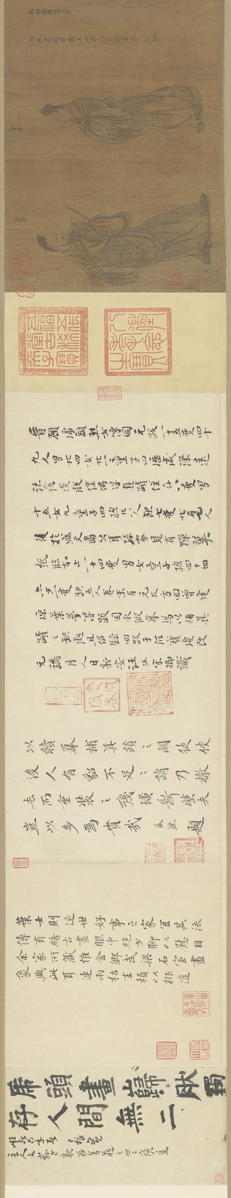 卷幅前有无名氏题:顾恺之列女图 一行,但字款漫漶,唯有 “恺” 字清晰可辨;卷后有元代新安汪注、宋卿,明代叶隆礼、王铎四家题跋。还有蕉林書屋、宣統鑑賞、宣統御覽之寳、乾隆御覽之寶、無逸齋精鑑璽、五福五代堂古稀天子寶、八徵耄念之寶等等钤印信息。