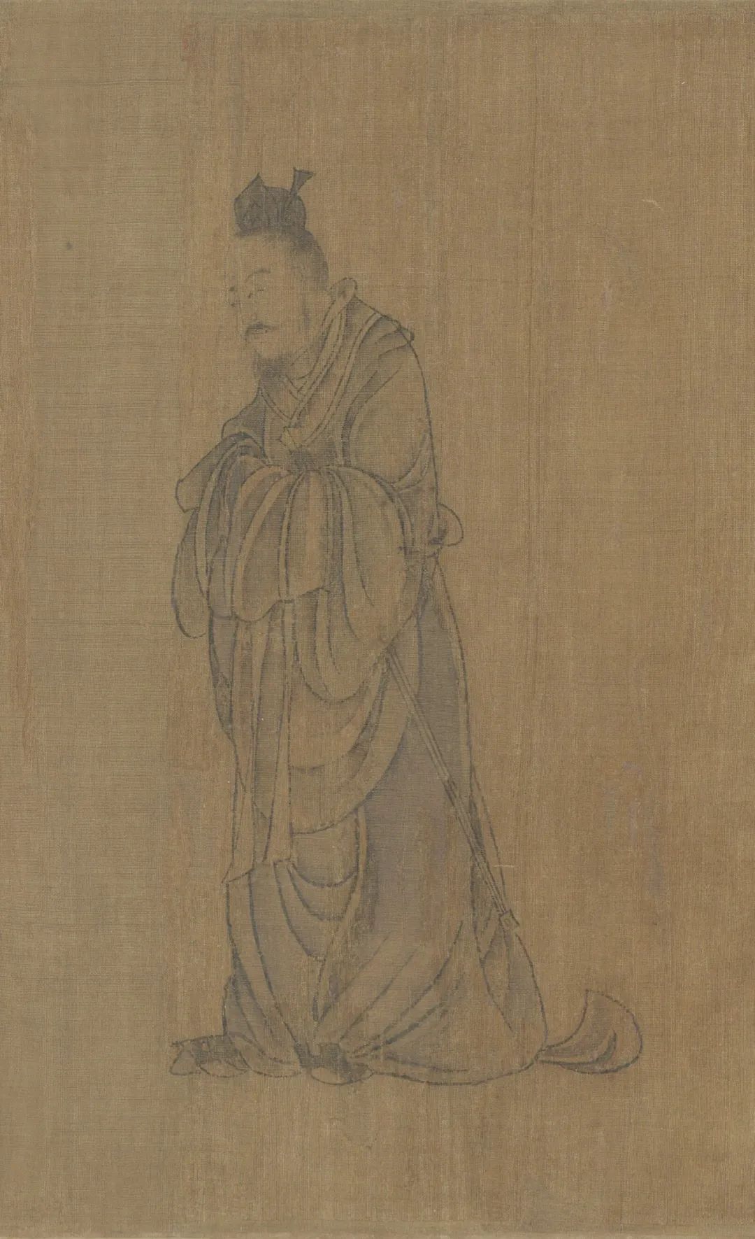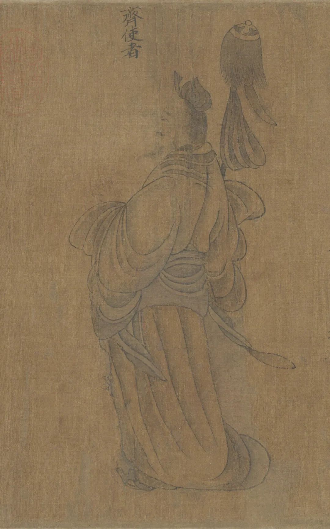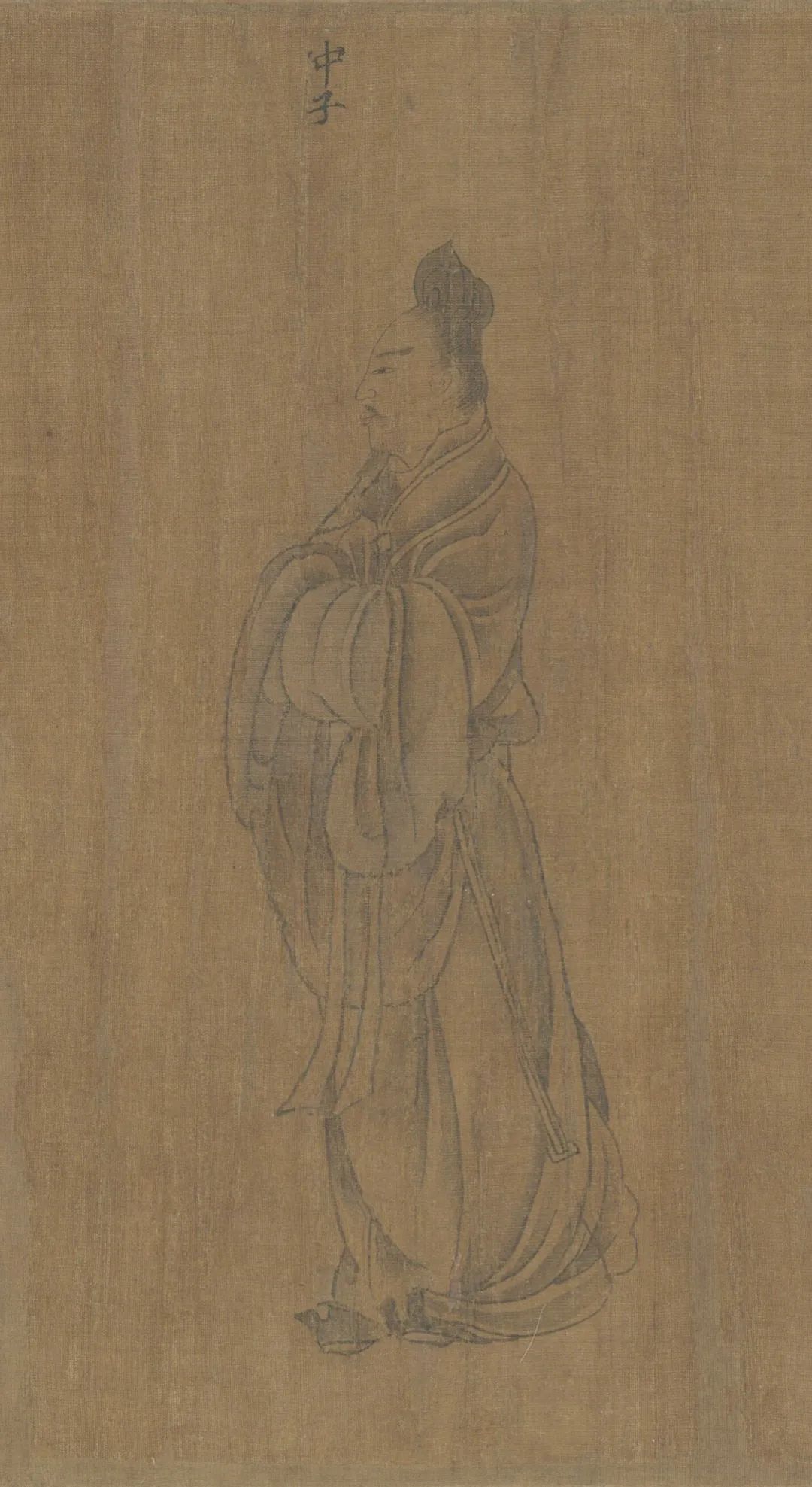 七、“齐灵仲子”故事,此段不全,只存一人。齐灵仲子是齐灵公的夫人。起初,灵公娶声姬,生子光,被立为太子,后娶仲子生子名牙,灵公欲废子光而立牙为太子,仲子辞说不可。图中太子光挥手而去,疾步中还回首一顾。