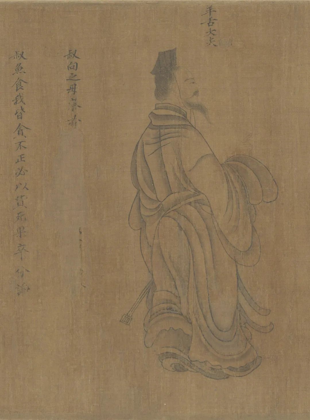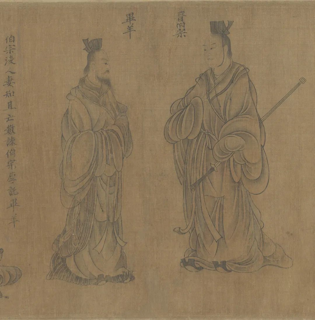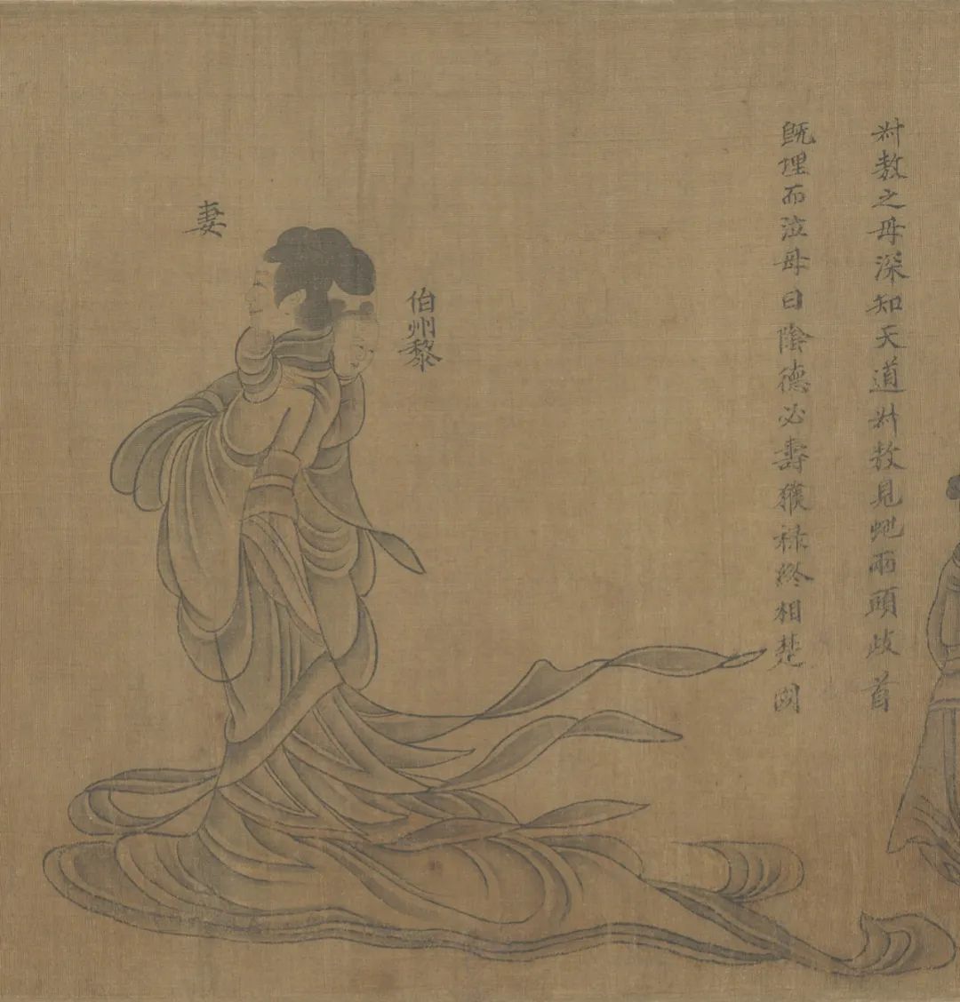 五、“伯宗妻”故事。伯宗式晋国大夫孙伯纠之子,为人好直言。图中其妻抱着幼子暗暗担忧,毕羊受伯宗妻之托,恳切地劝诫他改过。伯宗年轻气盛,昂首握剑’毫无顾忌之意,秉性耿直的形象十分鲜明。最终,伯宗因得罪了权贵而被诛杀。