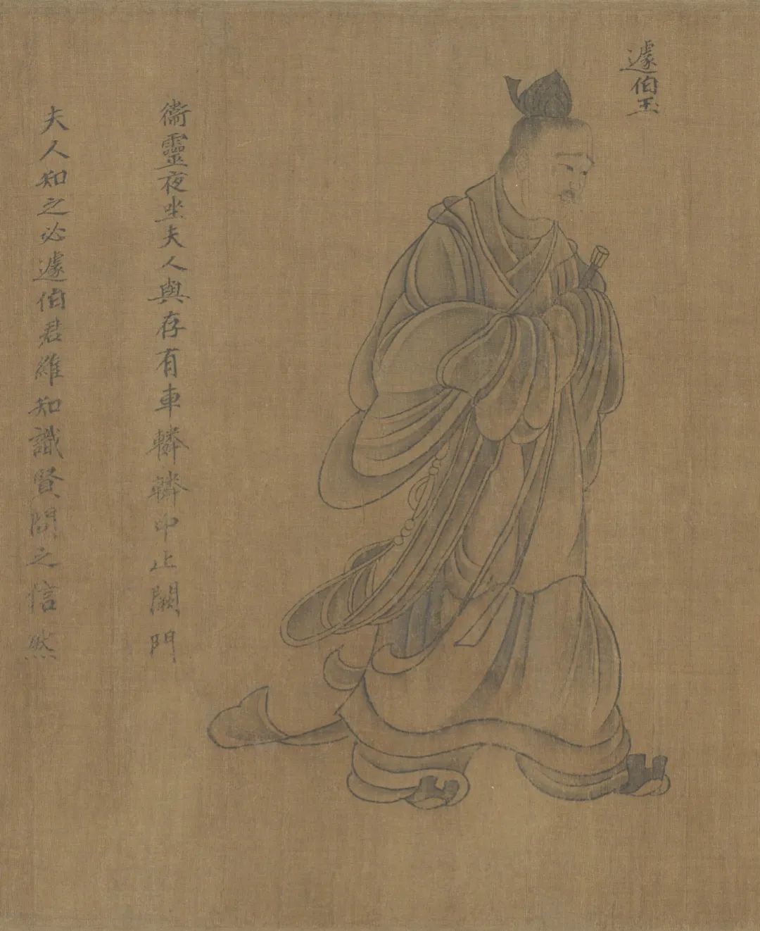 六、“卫灵公夫人识贤”故事。一天深夜,卫灵公听到宮外远处传来马车声,停息一会后又隐起。卫灵公夫人认定是蘧伯玉从门前经过,她说伯玉是贤臣,惟有他能自觉地在夜行中恪守礼制,在途经宮门时,会下车轻声缓行。卫灵公出去查询,果真是伯玉。图中卫灵公坐屏风内发问,夫人对坐回答,宮外画乘车和步行的伯玉,表现伯玉经过宮门前后的连续性动作。