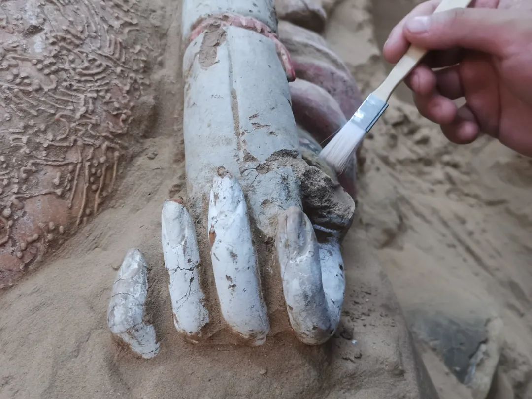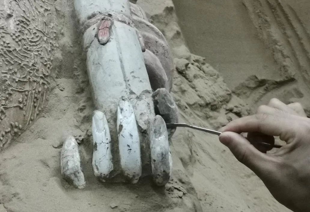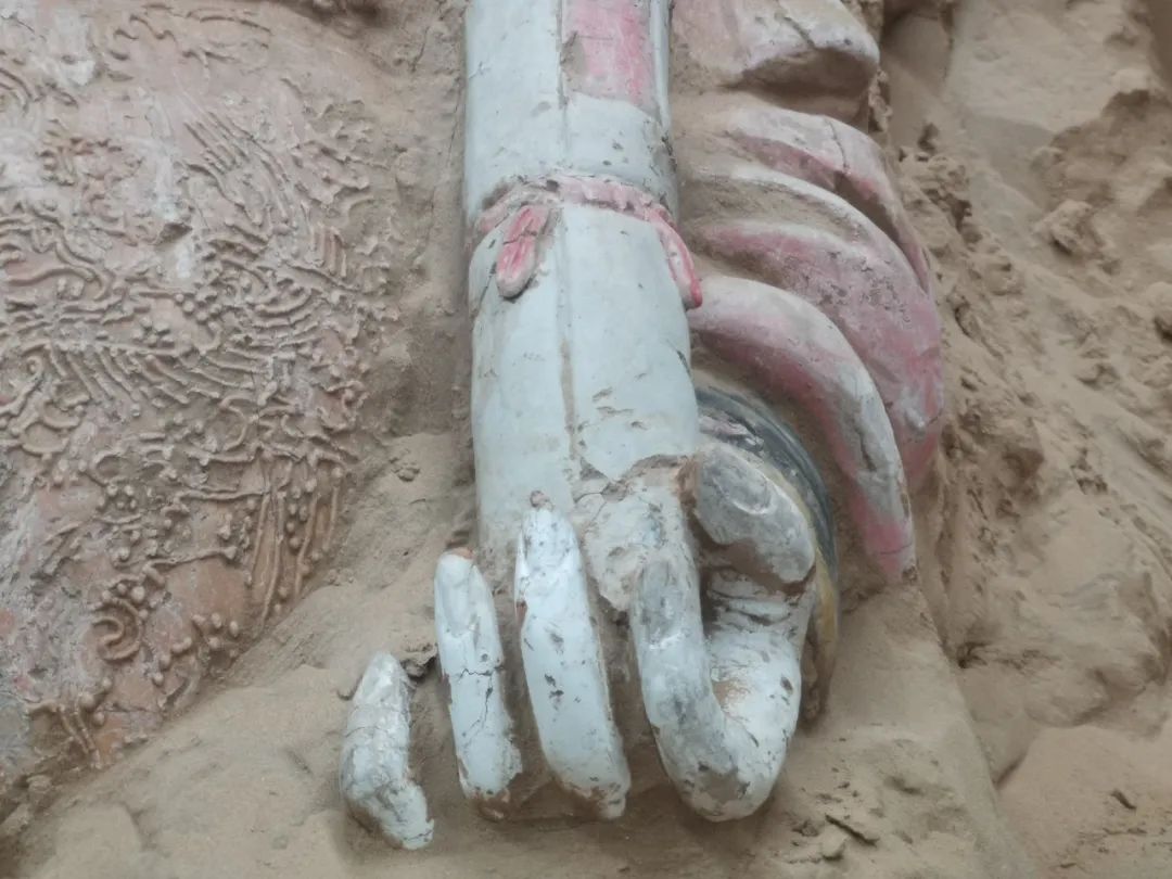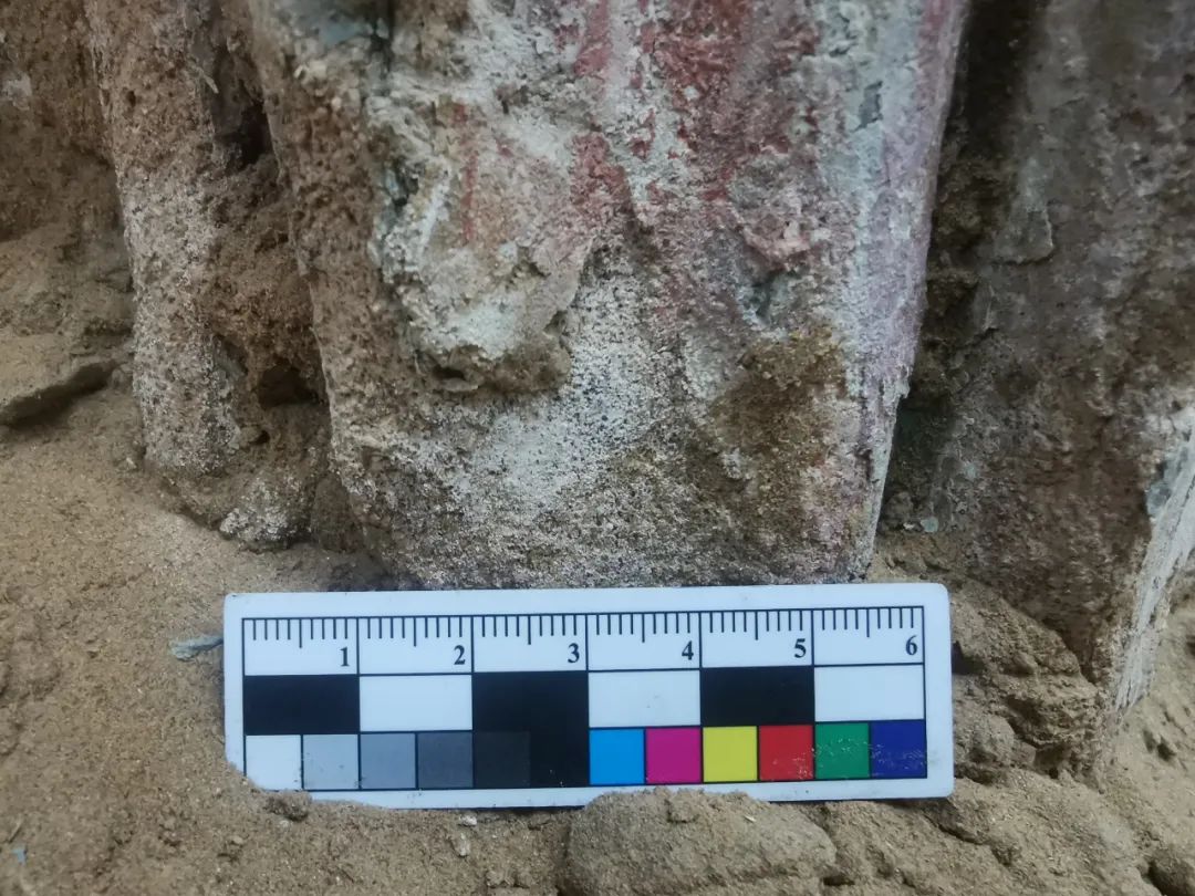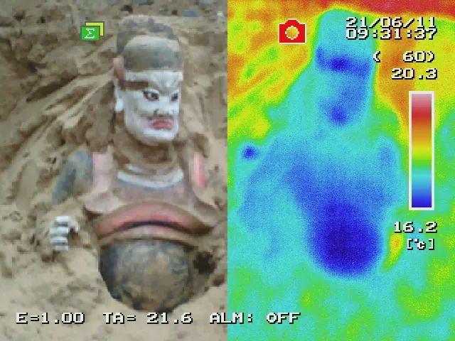 红外热成像调查发现,刚发掘出土的彩绘泥塑含水率极高,随着水分的蒸发导致可溶盐在沙—气界面聚集,形成盐带,加速界面区颜料层的风化脱落。同时,由于泥塑内部骨架完全糟朽,泥塑本体多处存在失稳、断裂。针对出土彩绘泥塑存在的以上问题,后期将召开相关专家论证会,探讨陕北出土泥塑的应急保护方法,确保彩绘泥塑保护的安全性及完整性。