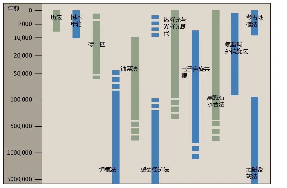 不同测年方法的适用范围(引自《考古学:理论、方法与实践》(第 6 版),上海古籍出版社)