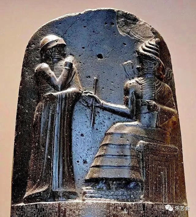 图2、3800年前后西亚埃兰出土的《汉谟拉比法典》上部,坐在右边座椅上头戴牛角帽的西亚太阳神沙马什、正在把手中代表神权的权杖递交给汉漠拉比国王。这幅雕刻说明《汉谟拉比法典》是最髙神太阳神授权汉谟拉比制定的,法律是神的使者代替神管理人民的规则,以此表明法典的神圣不可拒绝。同时也表明权杖是有神性的。(图片选自网络版权归制作者)[2]