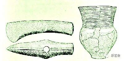 图5、从南欧到匈牙利的欧洲钟杯战斧文化流行的线纹陶杯和石质战斧。此战斧一头是斧刃,另一头是石锤的形制是欧洲权杖式战斧的传统形式。(图片选自网络版权归制作者)这种石制斧锤选用优质石材,不惜工本加工雕刻并研磨抛光,比梨形和圆形权杖头制作更加精制,与其它权杖头一样从工具发展成礼仪权杖锤斧在欧洲长期流行。并且随时间推移传播到西亚、非洲、北欧、中欧和东欧地区。在新石器时代影响中国东南沿海东夷民族地区、从石斧中发展出穿孔石斧和斧钺式权杖;在新石器时代晚期和青铜时代通过欧亚草原通道传播到中国西北和北方內蒙古地区,对中国西北和北方地区古代西戎和氐羌民族[3]的战锤式权杖产生重大影响,并且在中国形成了东夷民族斧钺式权杖和氐羌民族战锤式权杖二种形式。从石器时代一直沿用到青铜时代,这种战斧还在十六世纪传播到美洲印第安人地区。