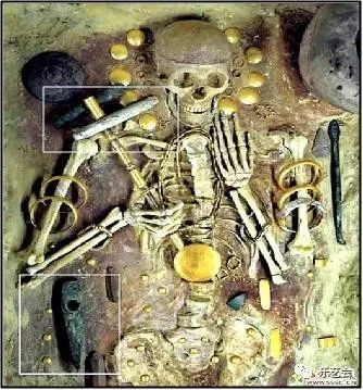 图4、保加利亚瓦尔纳氏族墓地M45号黄金墓出土二枚战斧式权杖战斧式权杖在西方有着悠久的历史,它由石器时代的石斧和石锤发展而来,融合了斧和锤的两大特点制成武器,然后发展成西方显示威权的权杖。其最早出现的时间地点因欧洲和西方缺少研究至今尚无法知晓;但是从考古出土资料看保加利亚6500年至6200年以前的一座酋长坟墓中因随葬了许多金器而在世界出名被称作黄金墓。其出土的金器在中国汉代江西海昏侯墓发现之前是世界上出土黄金器最多的坟墓。值得注意但常被疏忽的是:其坟墓中出土了二件石制战斧,一件由死者右手执掌,其奇特之处是这枚石制战斧竟然穿在黄金制成的手柄上,显示出这枚石战斧似乎比黄金还要珍贵。从它握在墓主手中具有典型的权杖形式和性质看,这种石战斧具有权杖的威权标志作用无庸置疑。还有一枚石战斧在死者腰部。因为这种战斧一头是斧另一头是锤的形式,我们暂且把这种石战斧称作斧锤式权杖。(保加利亚黄金墓的战斧式权杖李水诚先生书中也有介绍,只是说M45号墓出了一枚黄金柄石质战斧权杖, 另一墓M35出土一枚黃金质战斧权杖. 因资料来源不同略有差异, 我们暂时以博物馆图片为准.)保加利亚的这一考古证据至少证明了三个问题;一是石斧锤是权杖标志物,具有明确的权杖意义。二是石斧锤当时珍贵胜过黄金。否则只要用黄金直接做个斧锤就可以了,为什么用石头做斧锤,再用黄金作手柄呢?(不过M35号墓也有黄金直接做成的战斧式权杖, 但至少可以说当时的石质战斧权杖与黄金有同等价值,)其三是证明欧洲地区在6500年前后巳有石斧锤作权杖的实物。而从权杖斧锤的成熟程度看这种斧锤从工具演变成权杖还必定有一个漫长的发展过程,既欧洲石斧锤产生的时间可以大大提前决不止6500年。图4、欧洲东南巴尔干半岛的保加利亚瓦尔纳氏族墓地M45号黄金墓出土二枚战斧式权杖。我们从图中方框中可以更清楚看到上部白色石质战斧穿在黄金制成的手柄中,从墓主的地位等级看他是一位氏族的酋长和首领,这枚金柄战斧被墓主执掌在右手中,具有明显的权杖性质,也被世界公认是权杖。还有一枚无柄黑色战斧在墓主腰间。此墓可以证明考古学上很多真实问题、是不用争论的证据。既石质战斧在6500年前后的欧洲已经具有权杖性质。(图片选于网络版权归制作者)在欧洲新石器时代,欧洲还有一个很有名的“钟杯战斧文化”。这个文化以线纹陶器大水杯和石质斧锤闻名。这个文化是欧洲青铜时代早期文化,年代在4500年前后。该文化流行在西班牙、法国、不列颠英国和德国等莱茵河、易北河、罗纳河和多瑙河地区。这里的战斧是一种一头是锤、一头是斧刃,中部有装柄孔的石斧锤,其形制与保加利亚黄金墓的石质斧锤相似,可见欧洲流行的钟杯战斧文化就是当时部落酋长头人使用以线纹陶杯和石斧锤权杖为标志的一种贵族文化。是保加利亚战斧权杖的延续,石斧锤作权杖在欧洲有长期的传统。(可阅读李水诚先生书中欧洲部分权杖的介绍) 这种斧锤式权杖直到青铜时代3200年前后古希腊迈锡尼国王阿伽门侬与特洛伊国王普里阿摩斯发生的十年特洛伊战争时还在使用。从特洛伊出土的精致的石斧锤不难看出它们在几千年后的西方仍然具有权杖的性质。