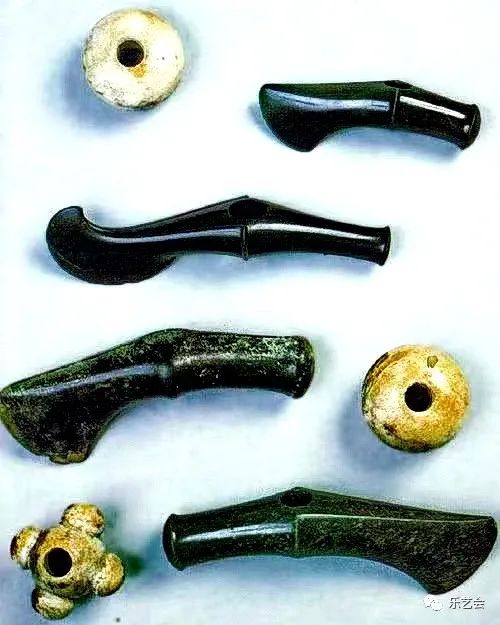图6、3200年前后西亚古希腊迈锡尼国王阿伽门侬的联军进攻普里阿摩斯为国王的特洛伊城,为争夺美女海伦打了十年仗,最后以特洛伊被木马计攻破失败结束。这是特洛伊出土的战斧式权杖,从其使用黑色大理石和黑色玄武岩等髙级石材为原料、精工细作加工而成的实物看,它们决不可能是工具,与其它形制的石权杖一起展出表明它们是权杖无疑。从6500年保加利亚的石战斧权杖到4500年前后钟杯战斧文化的战斧式权杖直到3200年前后特洛伊的战斧式权杖,我们可以看到西亚欧洲战斧式权杖传统的存在。(图片选自网络版权归制作者)二、中国新石器时代和青铜时代的斧钺式权杖和战锤式权杖