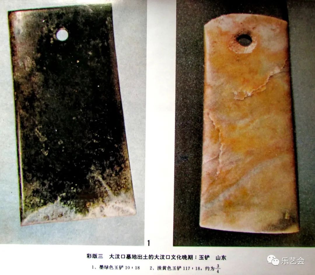 图9、山东大汶口文化出土的6300年前后的玉钺,(钺就是穿孔石斧和石铲)被认为是中国东夷民族使用穿孔石斧作斧钺式权杖的最早证据之一。它们是长江下游良渚文化的先民。在气候变化中从北部向南部沿海发展的东夷民族。[4](图片选自山东省文物管理处、济南市博物馆合编、1974年文物出版社出版《大汶口——新石器时代墓葬发掘报告》)