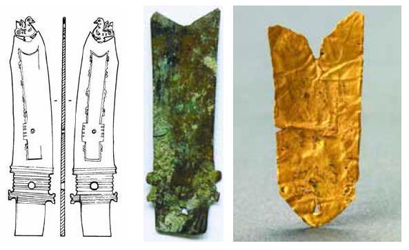 其中,三星堆文化继承了中原地区夏部族使用牙璋的传统,并发展了牙璋的使用功能,牙璋成为古蜀国国家层面的祭祀重器,其形制发展达到了顶峰。所以,三星堆与金沙遗址出土的牙璋数量众多、形制多样,并且出现了铜牙璋(图4),甚至还出现了作为组合装饰的牙璋形金箔(图5)。金属牙璋的出现,是国家层面政治文化活动中流行使用牙璋的缩影。