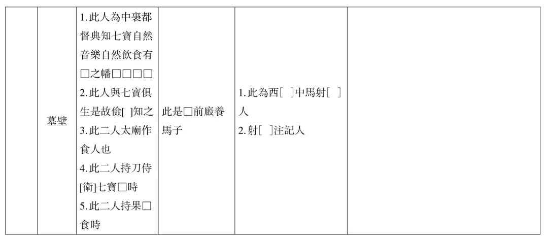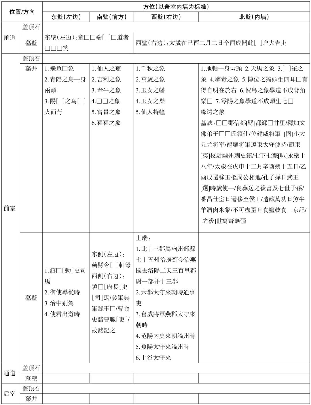 前室南壁西边上下分开,画有墓主统领的幕府官吏们。左边中间用墨书分四行书写“鎮□[府长]史[司]馬參軍典軍錄事□曹僉史諸曹職[吏]故銘記之”字句。