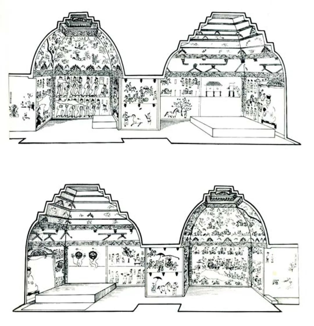 后室的四壁与藻井像前室一样用檩子隔开。值得一提的是,与前室不同后室的藻井是“人”字斗拱与三角火焰纹、云纹等装饰而成的。考虑墙面的七宝供养图、莲池、盖顶石上盛开的莲花,装饰纹中心的藻井是用来突显后室全部即是来世空间的。后室由地上和天上构成,从装饰来看,与前室是不同性质的空间。