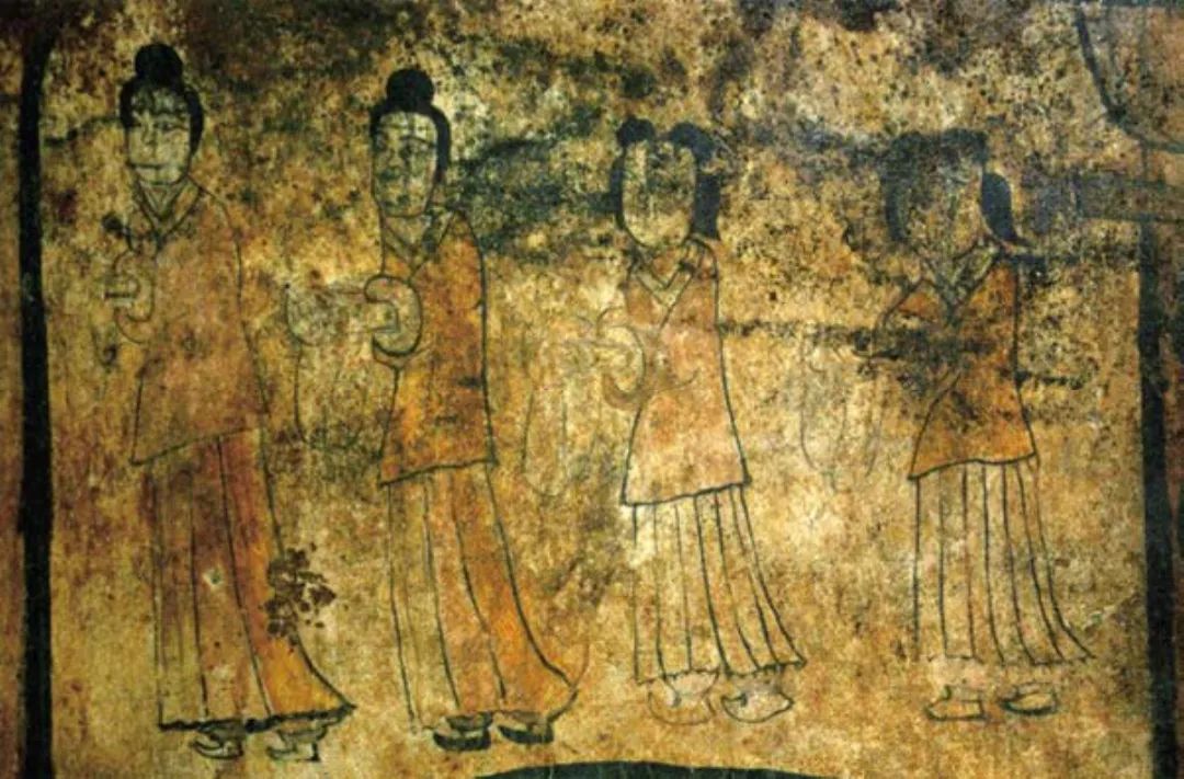 墓主夫人乘坐的牛车行列中侍女们在被遮阳棚遮挡的牛车左右站立成列。挽着发髻的女子们画得更大,没挽发髻的年少女子们画得小些。侍女们都着长襦和褶皱裙,裙子下面露出裤子的下端。