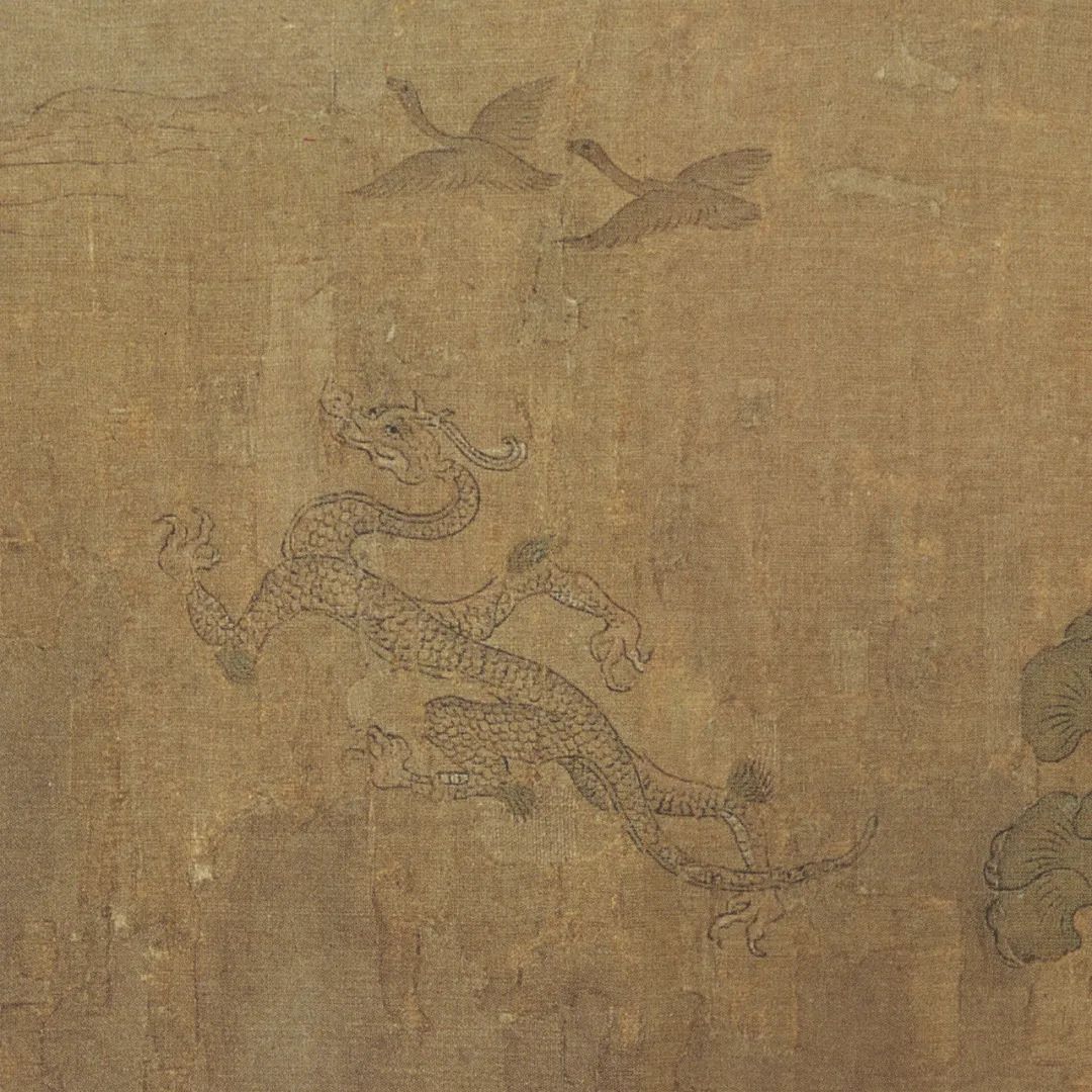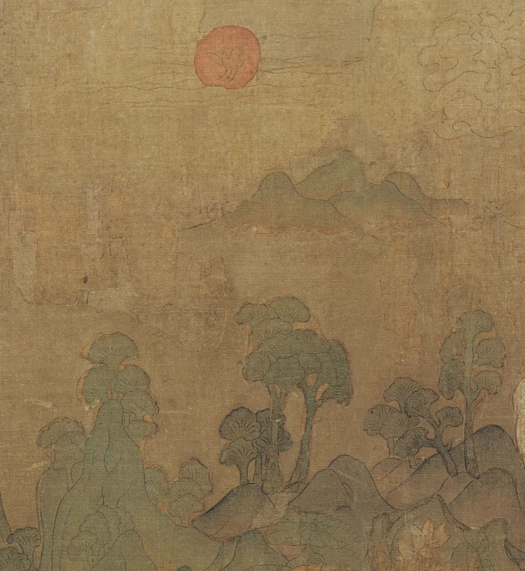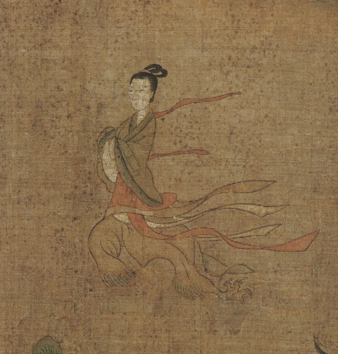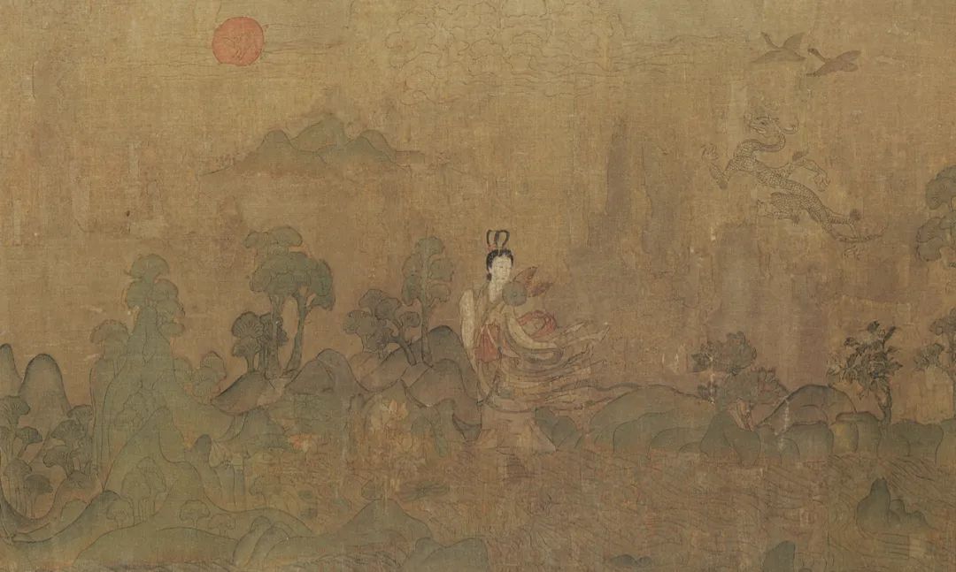 洛神明眸善睞,芳泽无加,欲行又止,令曹植一见倾心。曹植极尽华丽辞藻来形容洛神的娇美容貌和婀娜身姿。洛神的美远而望之,明洁如朝霞中升起的旭日,近而视之,鲜丽如绿波间绽开的新荷。图中以蛟龙、鸿雁、青松、旭日、荷花等暗喻人物样貌之美,与赋中含蓄而激情澎湃的表达完全吻合。