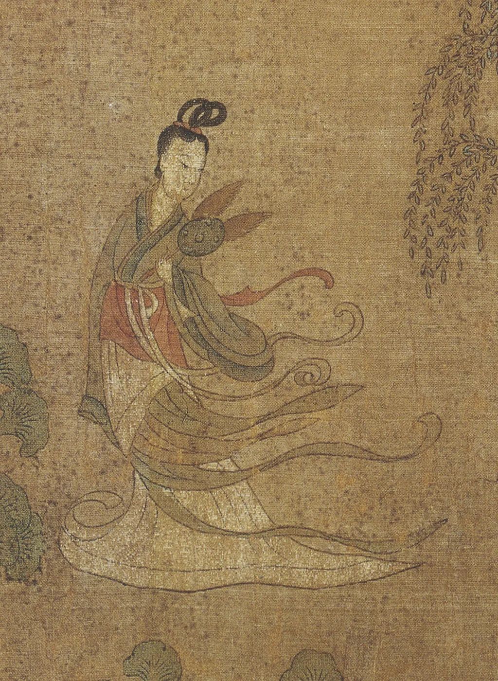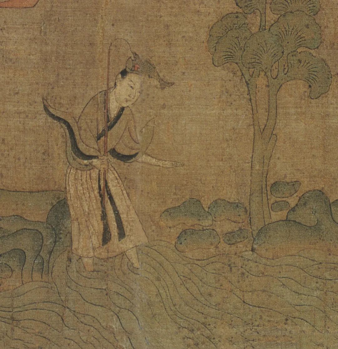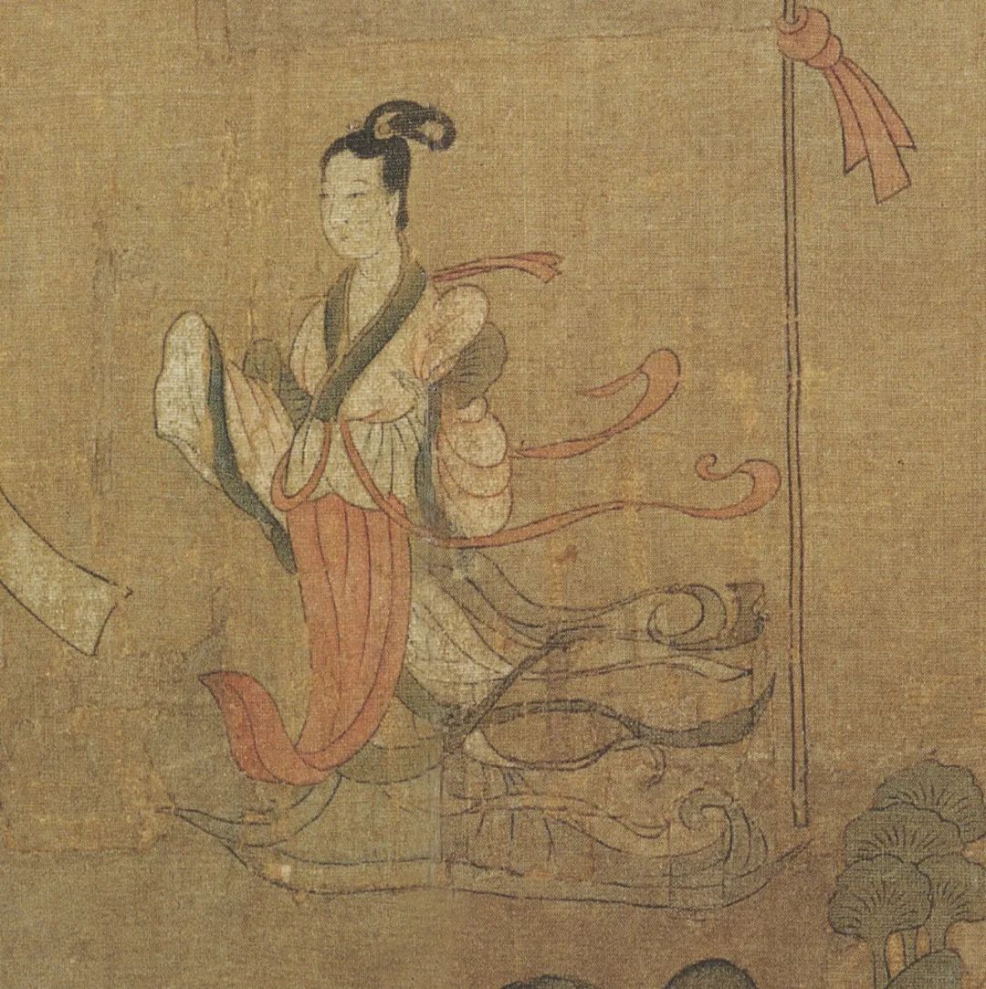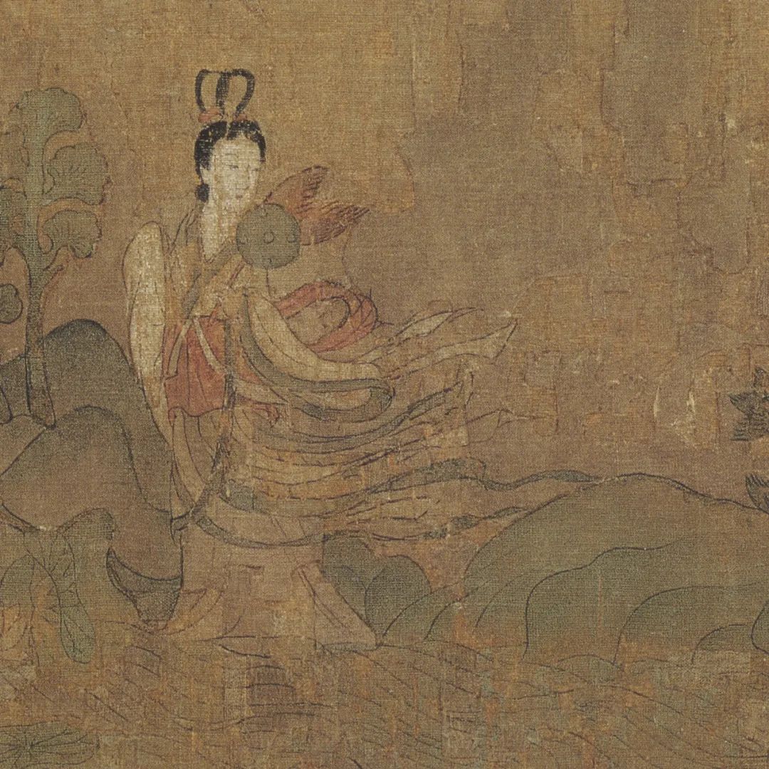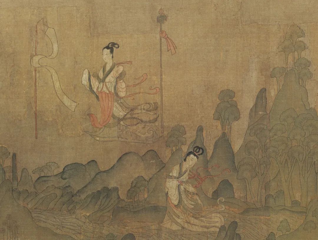 曹植则神情舒逸,纵目远眺水波浩渺的洛川。这时一位裙裾飘逸,手执麈尾扇,身姿雅丽娇柔,容貌端庄清秀的佳人突然出现,伫立于山崖之旁。