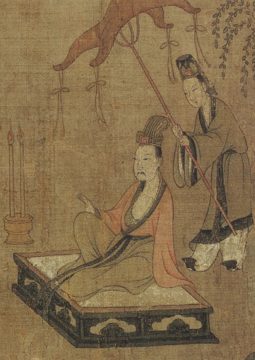 满心希望洛神能够再次出现,曹植不顾一切地驾着轻舟奋力追赶,但洛神已不见踪影,曹植站在船内凝目远望惆怅万分。这里有一个细节:一直握在洛神手中的羽扇,此刻出现在了曹植手里。