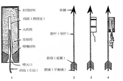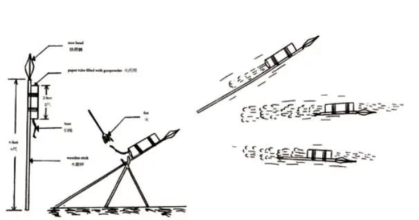 据北宋曾公亮编撰的《武经总要》记载,“火箭,施火药于箭首,弓弩通用之,其傅药轻重,以弓力为准。”12 世纪,金国发明了飞火枪,这也是一种较早的火药箭。