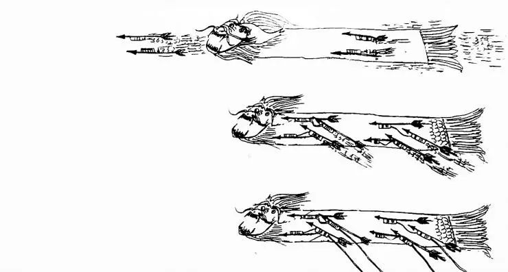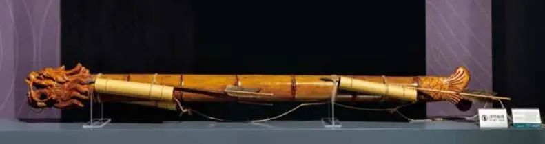 “火龙出水”是元明时期出现的火箭火器,也是世界最早的二级火箭。“火龙出水”的筒体由毛竹制作而成,龙头与龙尾由木头雕刻而成。火龙腹内藏数支火箭,龙头、龙尾处各有多只火箭,腹内火箭与龙头、龙尾火箭用火药线串联,龙头、龙尾火箭则由一根总火药线串联。士兵使用“火龙出水”时,先将其放在距离水面 3—4 尺(1—1.33 米)高的位置,点燃总引线,进而将龙头、龙尾处火箭点燃,产生巨大推力飞行,外面火箭的火药燃尽后,又引燃腹内火箭,使其从龙口处射出,继续飞行来攻击敌军船只。“火龙出水”的射程可达 2—3 里(1000—1500 米),被李约瑟誉为“原始的阿波罗火箭”。