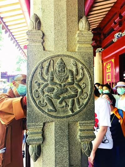 在开元寺,泉州多元文化共存、包容的特点再一次得到印证。开元寺是宋元泉州规模最大、官方地位最突出的佛教寺院,在这里居然有多处印度教的遗迹。开元寺僧人释德远引导记者观察大殿月台的须弥座。果然特别!它的束腰处有73块狮子与人面狮身石刻,风格与印度教寺院里的人面狮身石刻非常相似。释德远介绍,这个须弥座是明代重修开元寺时从元末废弃坍塌的印度教寺移用至此。这说明,13世纪时泉州兴建过印度教寺院,而印度教在中国其他地区基本没有留下遗迹。另外,17世纪大殿重修时,在这座发展成熟了的中国佛教寺院中,居然使用了印度教主题的建筑构件,可谓是非常罕见的文化现象。