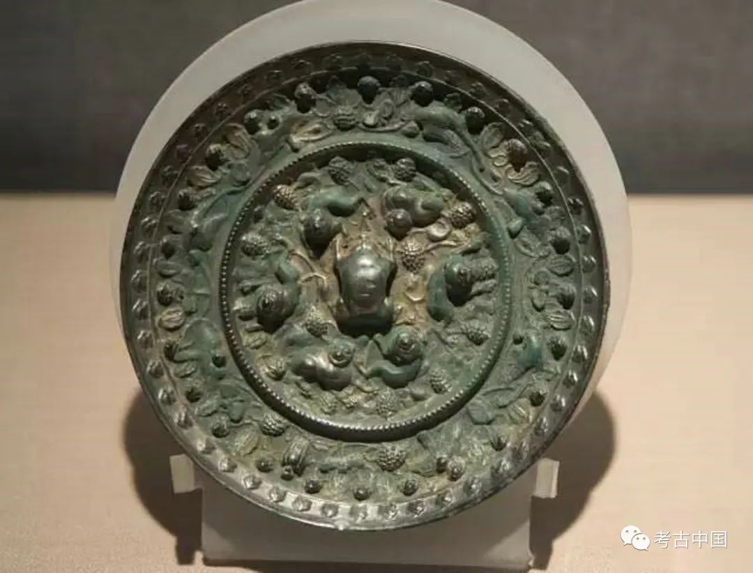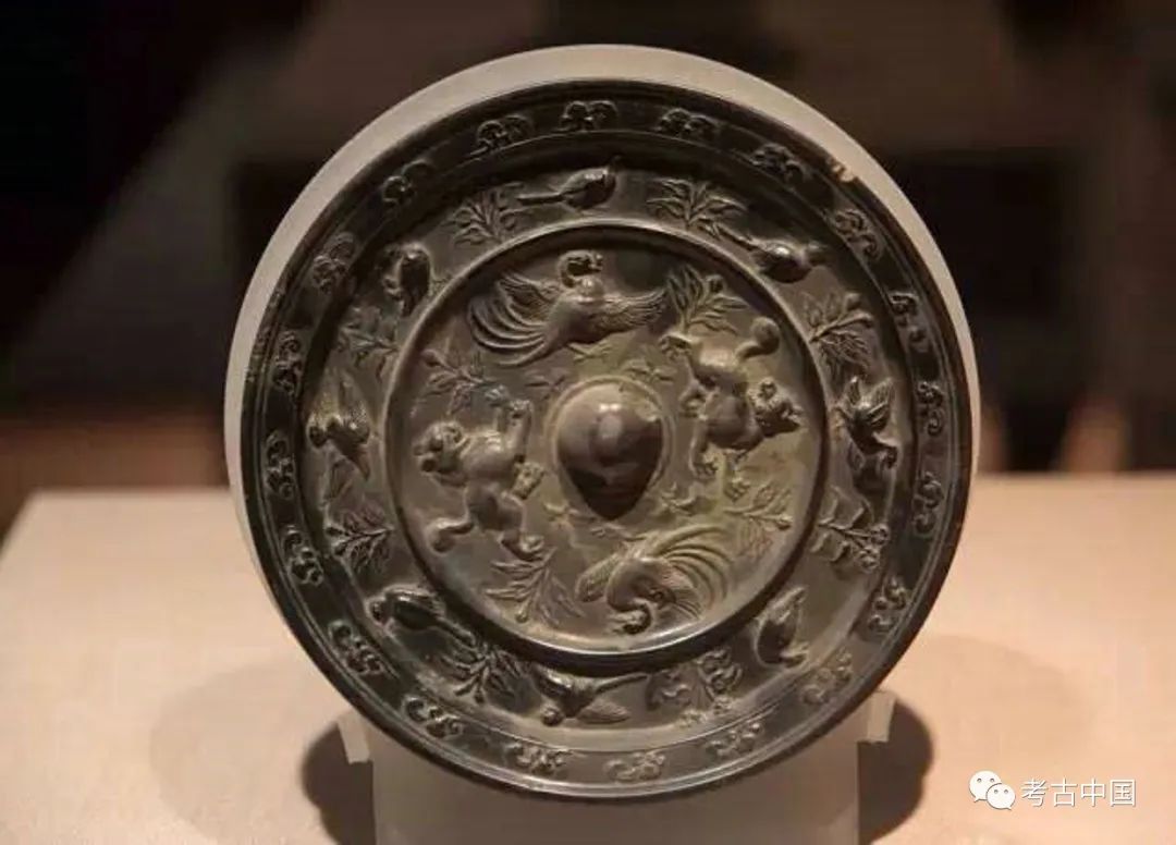隋唐墓中出土的铜镜,形式多样,工艺水平高,时代特征也较明显。第一期墓葬所出的铜镜,多为圆形,但也偶见方形。早期盛行的纹饰有四兽、六兽、四神、十二生肖、团花等。7世纪中叶以后,流行葡萄、瑞兽、鸾鸟等花纹。第二期的铜镜,在造型和工艺技术方面都有重大的发展。