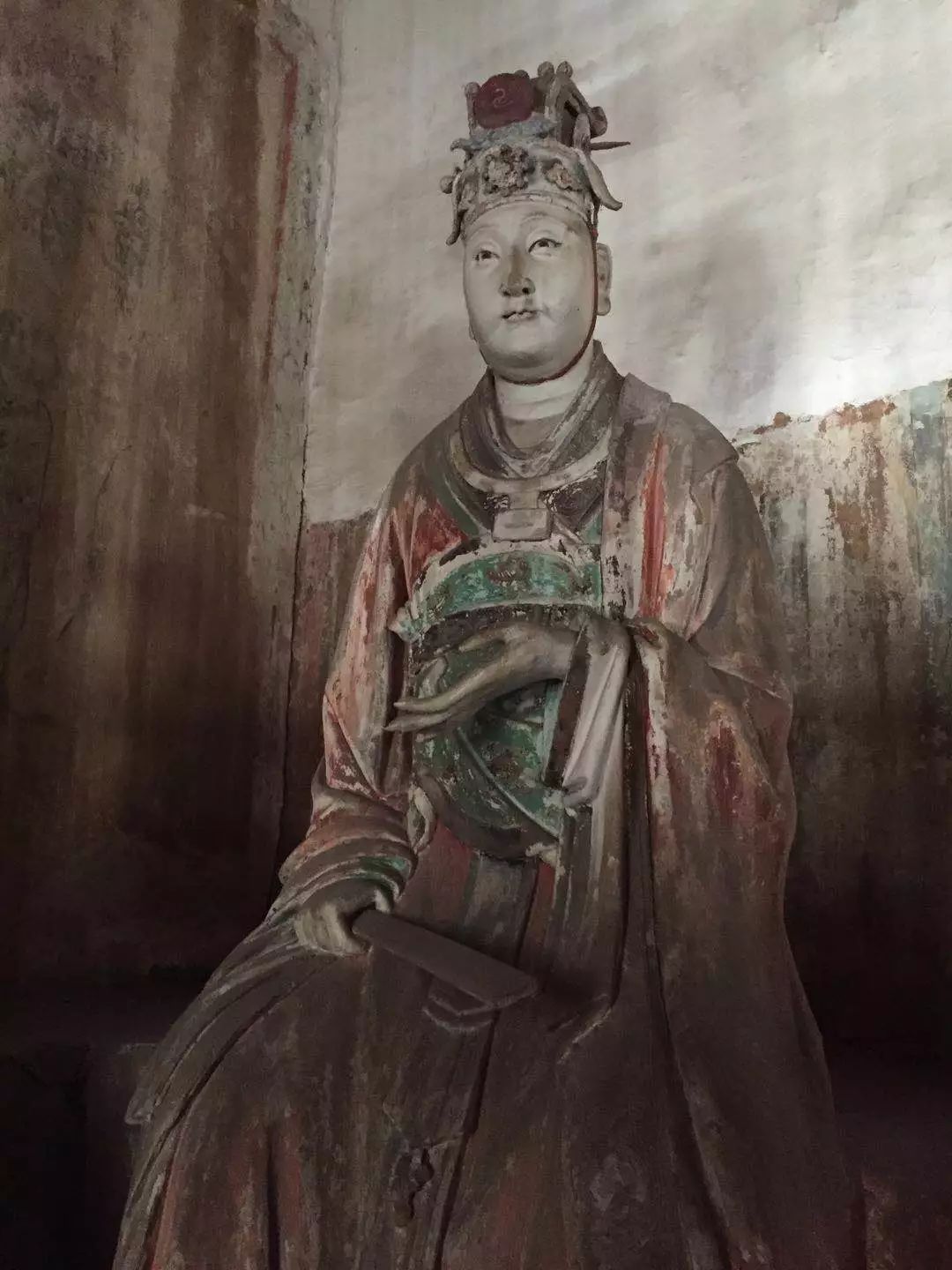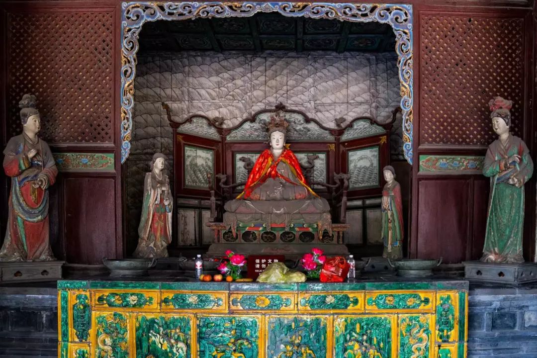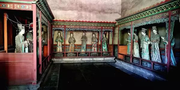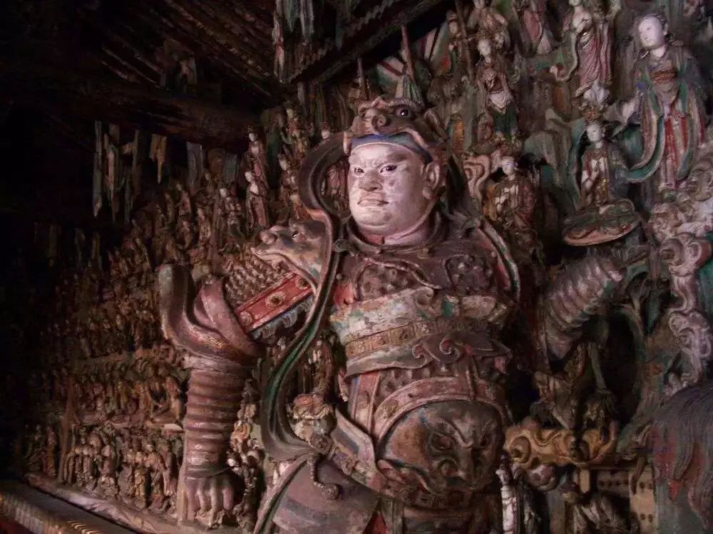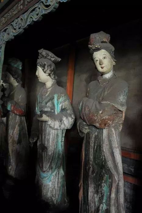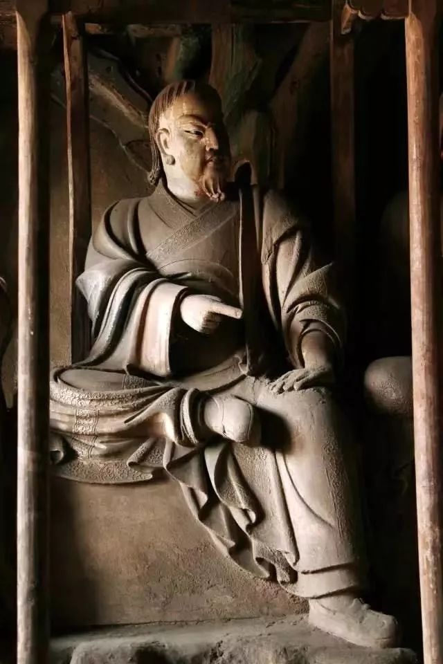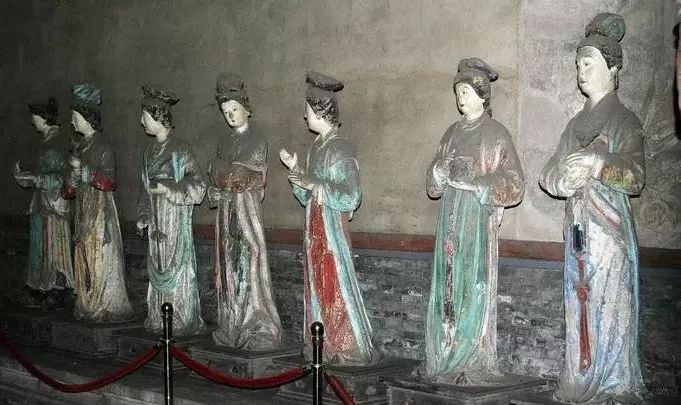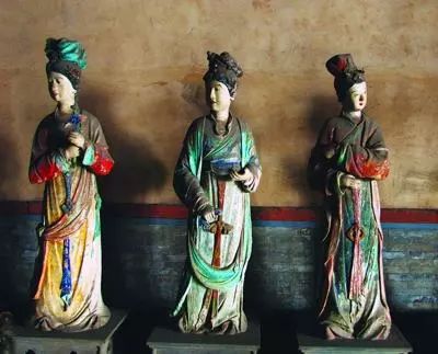 下面就我国彩塑保存最多的地区山西省的几处景点彩塑讲一讲。晋祠的起源真是古得很,还是周成王封他弟弟叔虞于晋,后人纪念他,才修了晋祠。同时又为叔虞的母亲“邑姜”建了圣母殿。殿中央是“邑姜”像,左右两庑就塑造了四十多位侍者。此殿初建于北宋的天圣年间,重修于崇宁元年(公元1102年)。在殿内圣母像的座台背后有墨书元祐二年(1107年)的题记,那么,这堂雕塑完成于元祐二年,当是无疑问的了。 建造圣母殿的时代,正是北宋人才辈出的时代,司马光、王安石、苏东坡、黄庭坚、范宽、郭熙等等都在此前后活动着。而晋祠又早就是名胜之地。唐太宗亲自写了《温泉铭》。李太白写了“晋祠流水如碧玉,微波龙鳞莎草绿”的名句。