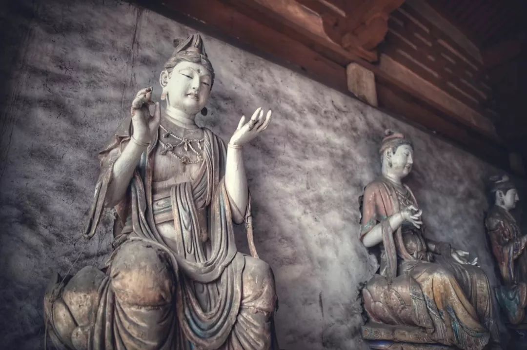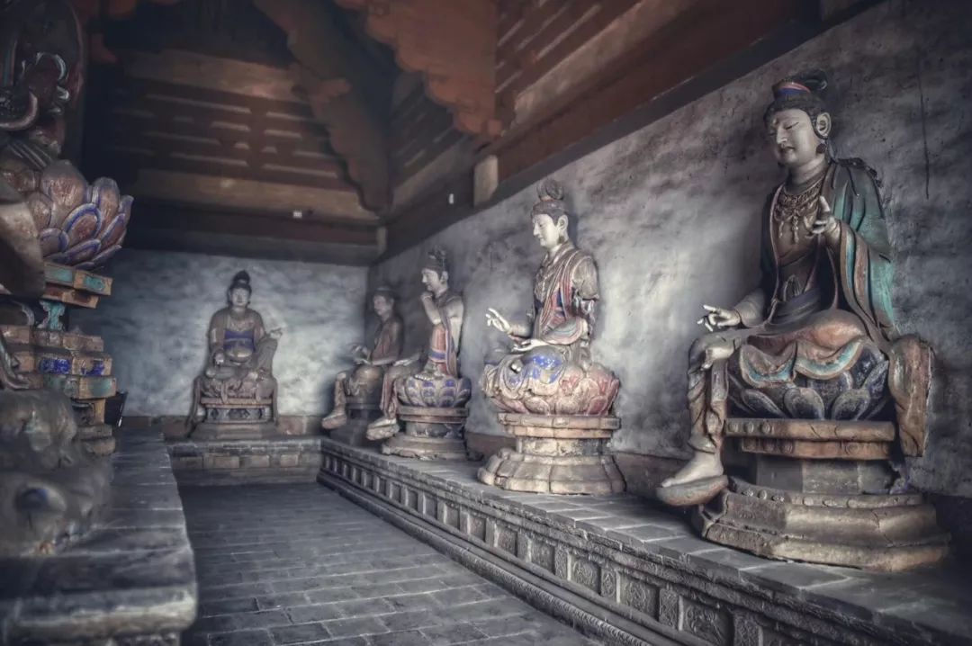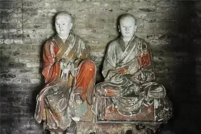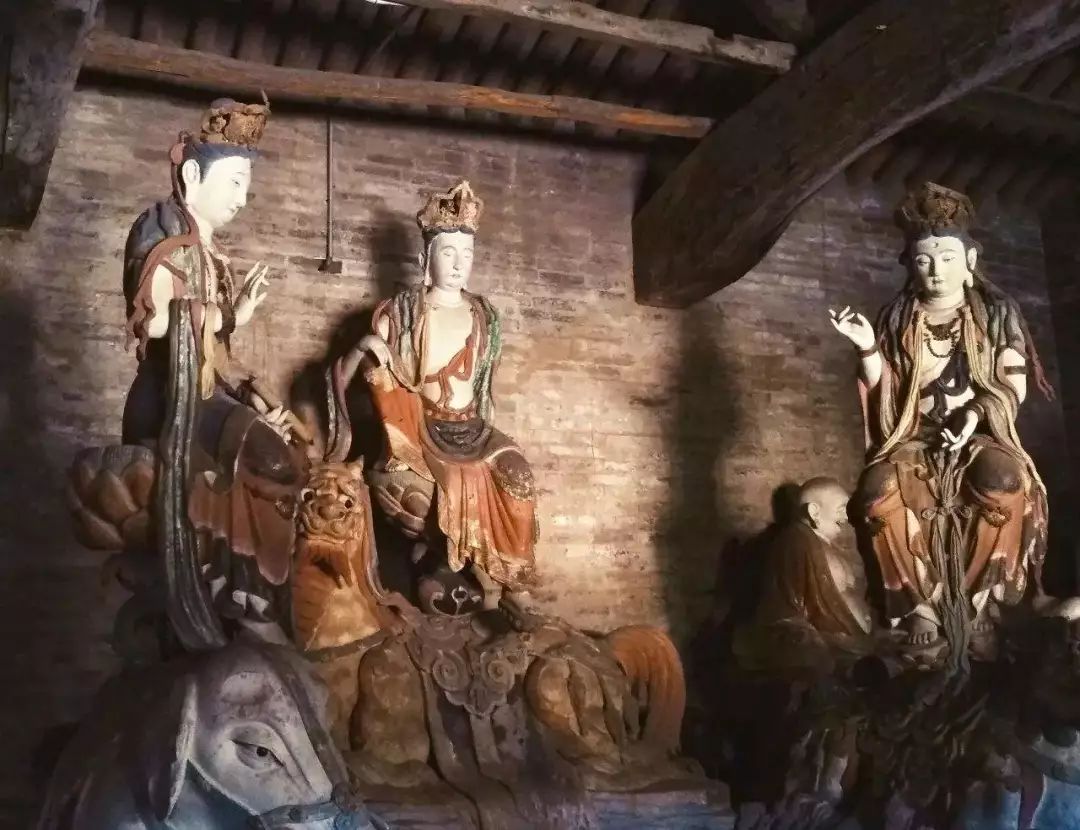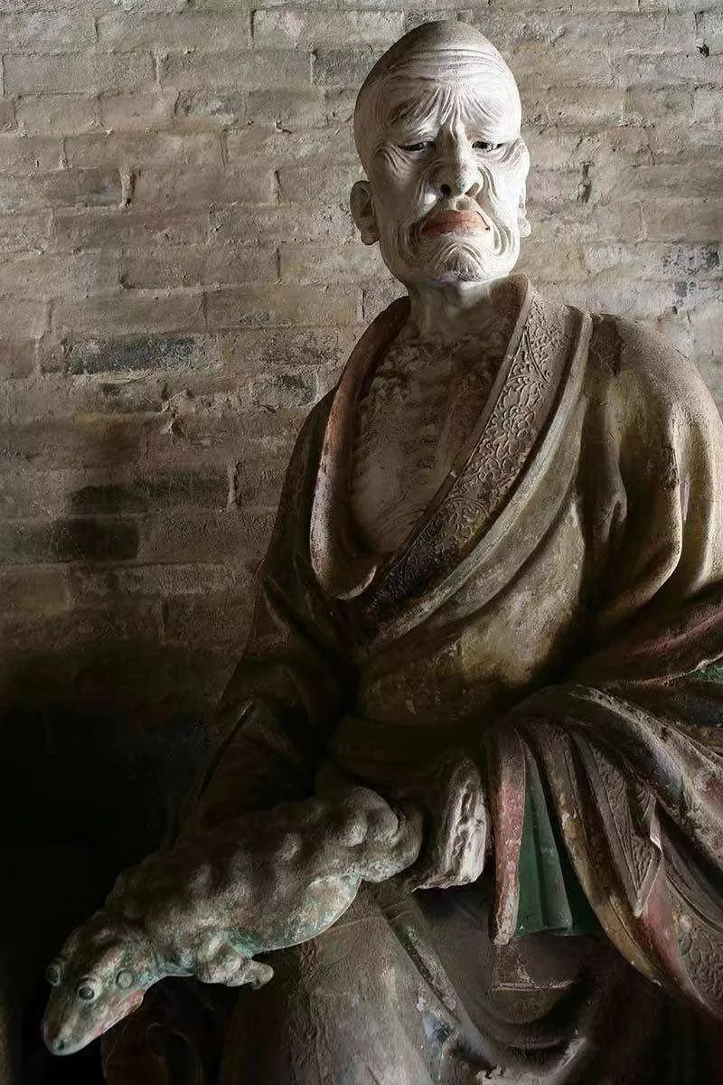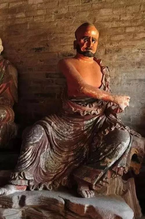 有趣的是这种美术风气的趋向竟是中外相近的。欧洲美术从文艺复兴以来,其实也出现了类似的过程,从典雅到富丽再到细碎繁琐这样的总趋向。而最令人向往的恰恰就是法兴寺的这个时期。也就是“文”“质”相称的时期,所谓“文质彬彬”,“然后君子”。与法兴寺相隔不远,有崇庆寺。处于长子县的一座小山上。庙不大而形势极好,建筑较为简朴,不知什么原因,庙的内部几乎全无装修,砖墙都末能抹缝,但三大士及十六应真之像水平极高,按彩塑作风而言似比法兴寺略晚。十六应真之中造型作风也不完全相同,特别是一伏虎罗汉(疑似降龙,实际伏虎罗汉为白脸汉相),全为梵相,肌肉浑圆厚实和其它罗汉相去甚远,色彩也偏红,较为浓重。而如“蛤蟆罗汉”(持一蛤蟆者)低眉沉思罗汉,及白脸如文士的罗汉等都骨相分明、转折确切、衣纹严谨、色调冷峻。
