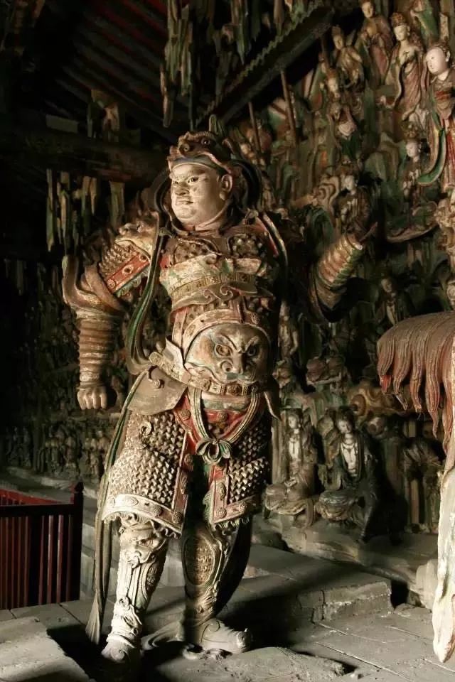 双林寺中的杰出代表就是这尊韦驮像。南宋以来,雕刻中逐渐强调线的组合和装饰而减弱了体积的表现力。但这尊像的作者却十分懂得造型的立体感和空间感是雕塑艺术的生命所在。 这尊像,尤其是头部的塑造,就具有强烈的空间意识,也就是特别强调头部的每一块形体都处于有深度的空间之中。所以显得这些骨骼肌肉的形体十分饱满,十分坚实,充满了一种涨力,刻划得雄壮英武、神采飞扬。汉民族的武士之美、男性之美得到了前所未有的体现。