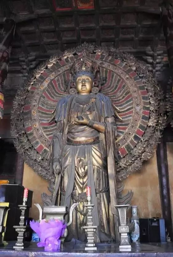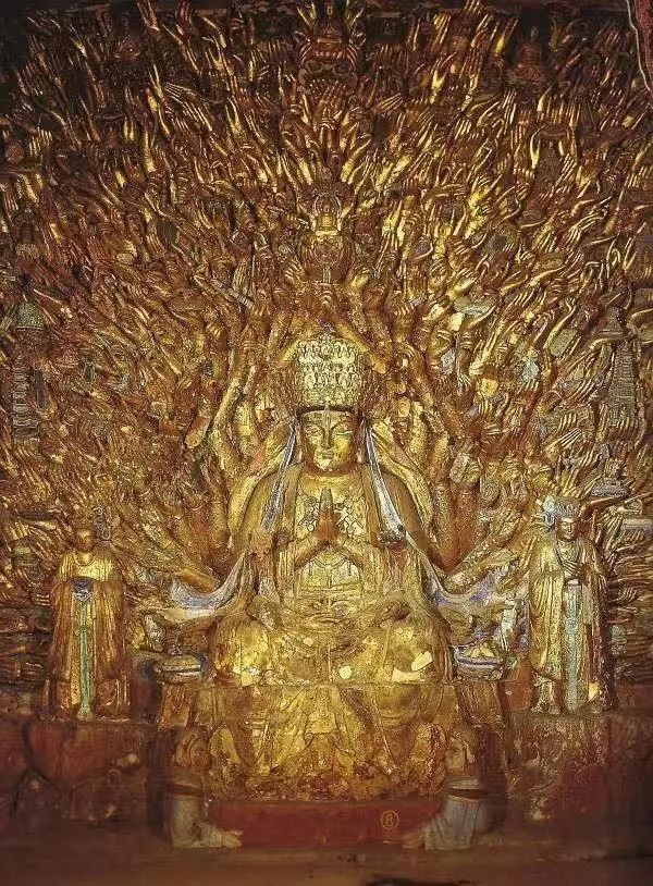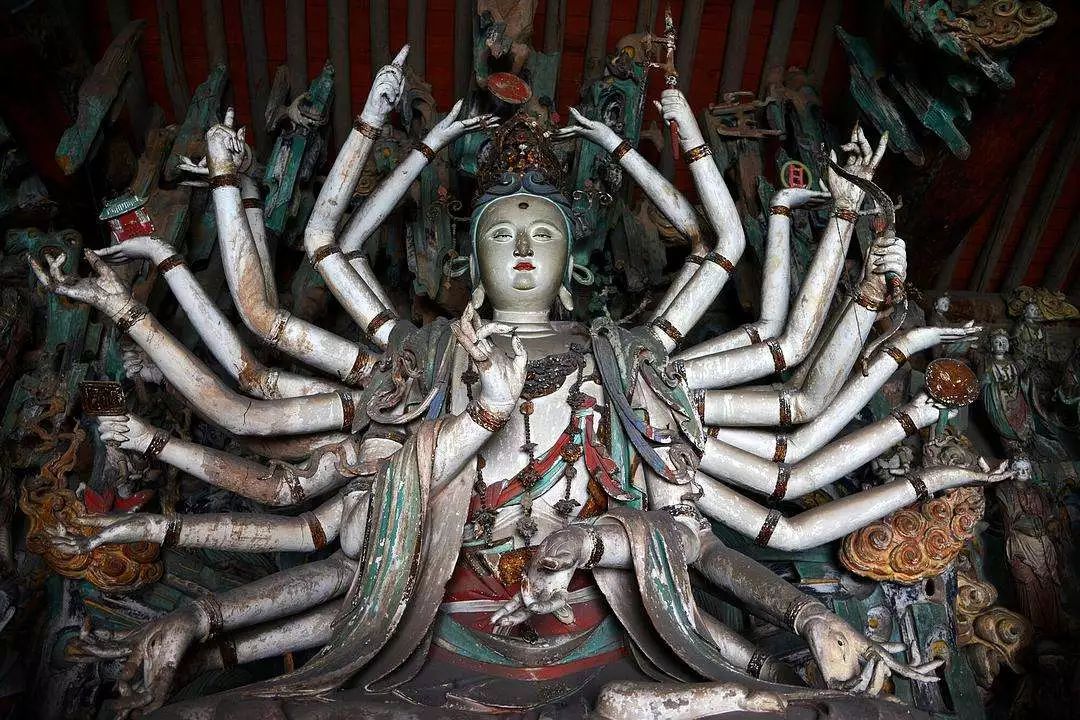 有的持重深沉,陷入深思,还有一位印度哲人,专注执着,目光明澈,有极准确的印度民族特征,完全不同于出乎想象,以稀奇古怪为归的一般像作。如果以学习民族雕塑传统为目的,我以为这堂罗汉是绝好的教材。长治市的观音堂建于明代,寺庙不大,堂中观音主像已为前几年重塑,不甚高明,而四壁悬塑,精彩照人。像分三层排列,下层像,几近半人,越上越小,檐间墙头,无一空处,内容庞杂,几可说包罗万象。中国宗教自元以后,渐有三教混一之势。因此这里名为观音堂,实则三教俱全,再加民间故事若干,千姿百态,趣味盎然。既有佛传本生,又有道家典故,孟母三迁,八仙过海之外竟有唐明皇游月宫等事,宫女抬轿,倚侧嬉戏,唐明皇则醉态百出,令人失笑。尺寸虽小,而塑造精当,宗教气氛虽已淡化,而“世俗化”,“民间化”趋向日益流行,这和明代的和尚“放焰火”,道士“做道场”,都要说唱讲故事以吸引广大群众。这类风尚是完全一样的。所谓“时代使然”,不可逆转了。太原市的崇善寺大殿中有三尊巨大的观音像,所谓丈六金身,宏丽无比。而尤以左侧一尊实为国内千手观音之最。以我所见,大足石窟的千手观音背后,千手安排得杂乱无章,拥挤不堪,实为败笔。其它各地有六臂、八臂、十六臂、三十六臂等等,包括正定隆兴寺大佛,都嫌累赘,支支杈杈、零零碎碎(指所持各法器),并无总体气势。相比之下,太原崇善寺的千手千眼观音,手安排却十分高明。这位作者将千手化作千道光芒。自观音背后分五层辐射而出,有似光轮普照。而光束之末有手,手中有眼,令人顿觉她法力无边,十方三界无不在她观照之中。这种效果恐怕正因为像的背后为大厅后壁,可作大浮雕的依托,前面为供案香桌等与观众留出一段距离。像为彩塑,色彩缤纷又能次序井然。这都是彩塑艺术已达十分纯熟的结果。