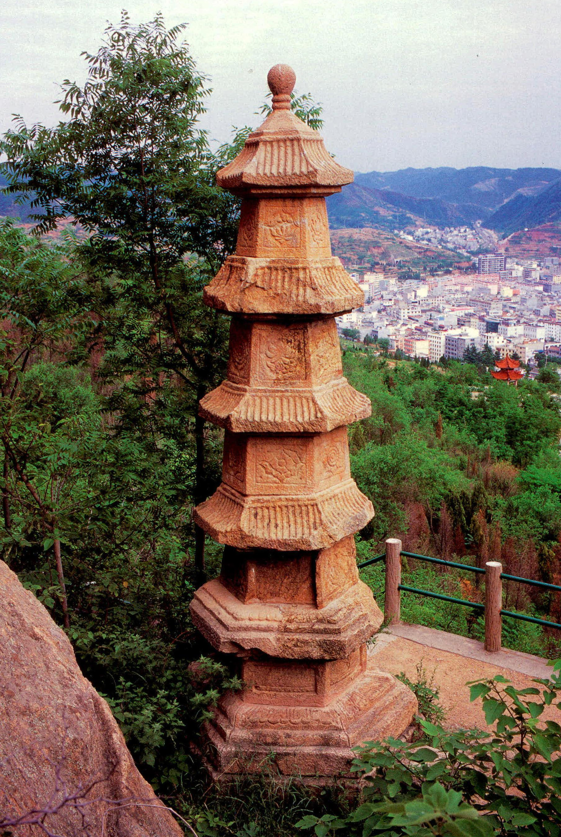 鳳冠山塔。丹鳳県城北の鳳冠山に位置し、建造された年代は不明だ が、建築スタィルから見ると、明代に建造されたと思われる。五稜五 級 密軒式のソリツド煉瓦塔で、高さは 7メ一トル、完全に保存され ている。