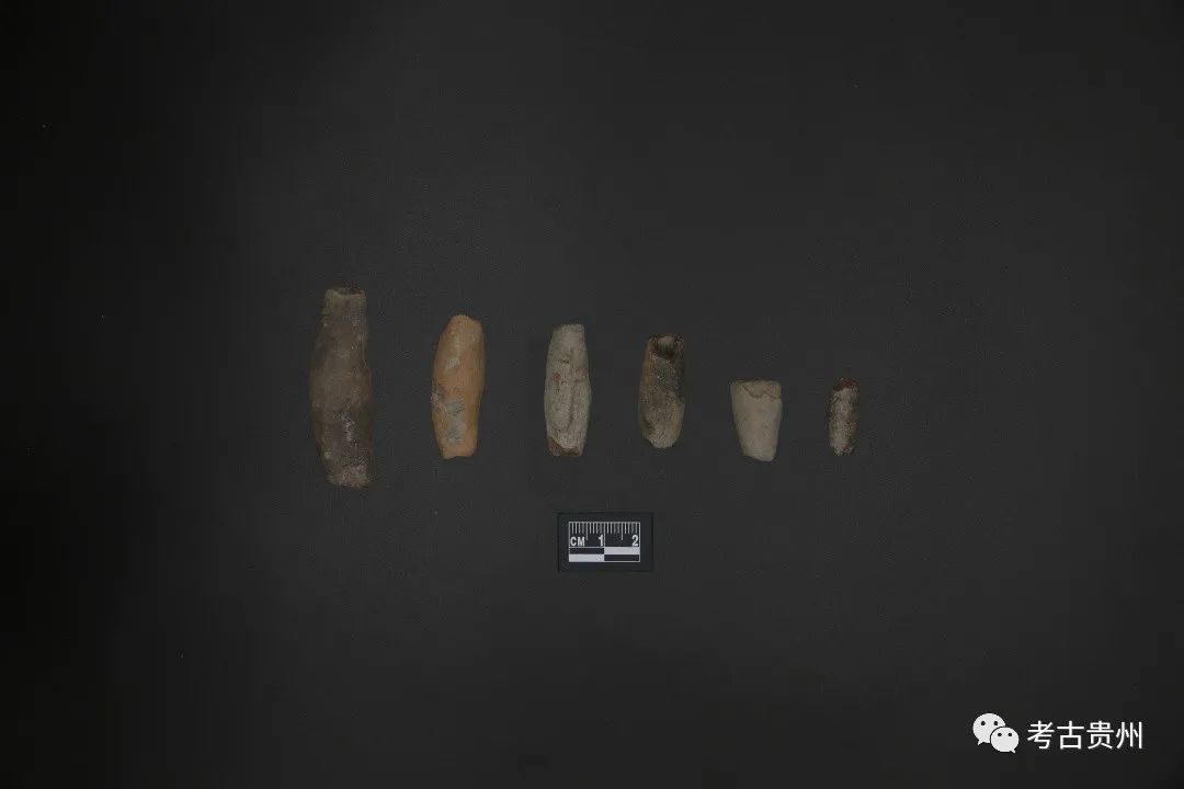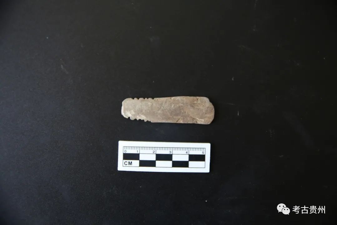 石制品出土较多,可分打制石器和磨制石器两类。打制石器有100余件,主要有石片、砍砸器、石锛、石斧等类型。石片主要为零台面石片,也有少量的自然台面和有疤台面石片。砍砸器、石锛、石斧等均是以砾石为素材加工而成,周身可见修理痕迹,基本上都属于砾石石器,少见石片石器。磨制石器也有100余件,多为斧、锛等工具,大多呈长方形或梯形,无段,无肩;多是在打制的基础上,施以局部磨光而成,磨制的部位多集中在刃部和两个侧棱。通体磨光的石器标本也有发现,数量不多。值得注意的是出土了约30件小型石器,器型有锛、坠?、镞、茅等,其中Ⅱ区H12出土了一件牙璋,为贵州首次发现,有极其重要的意义!