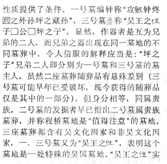 际上不是吴国之人,死后葬在吴国,很可能,吴王专门辟出一块墓地来礼葬这些“他乡之客”,使之继续成为吴国与周围列国之间联系的一种牢固的纽带。墓葬中出现的吴文化因素和非吴文化因素的结合正是这种现象的反映。因此,程桥墓地对于研究吴国和其他国家的关系有较为重要的意义。