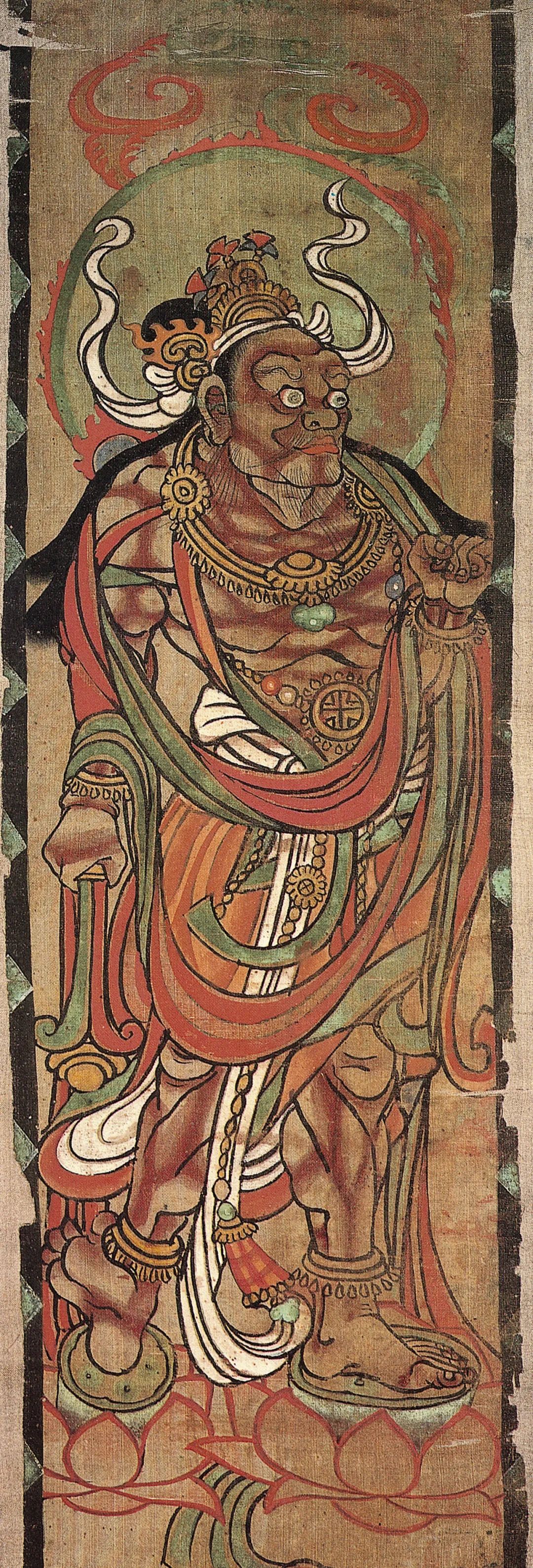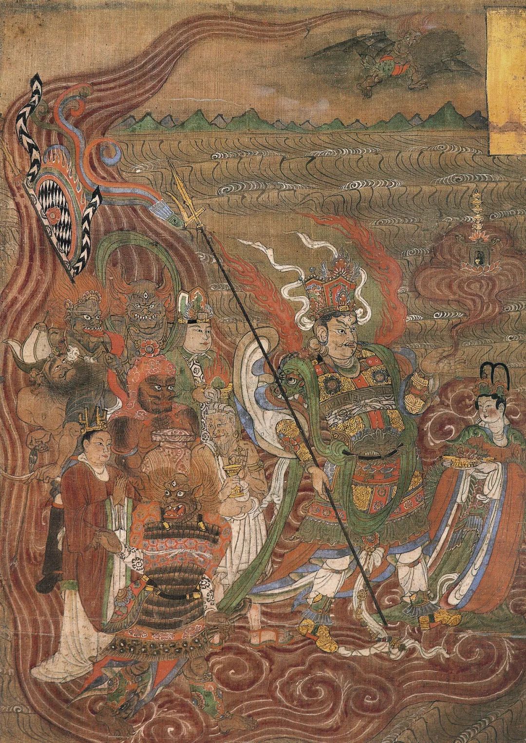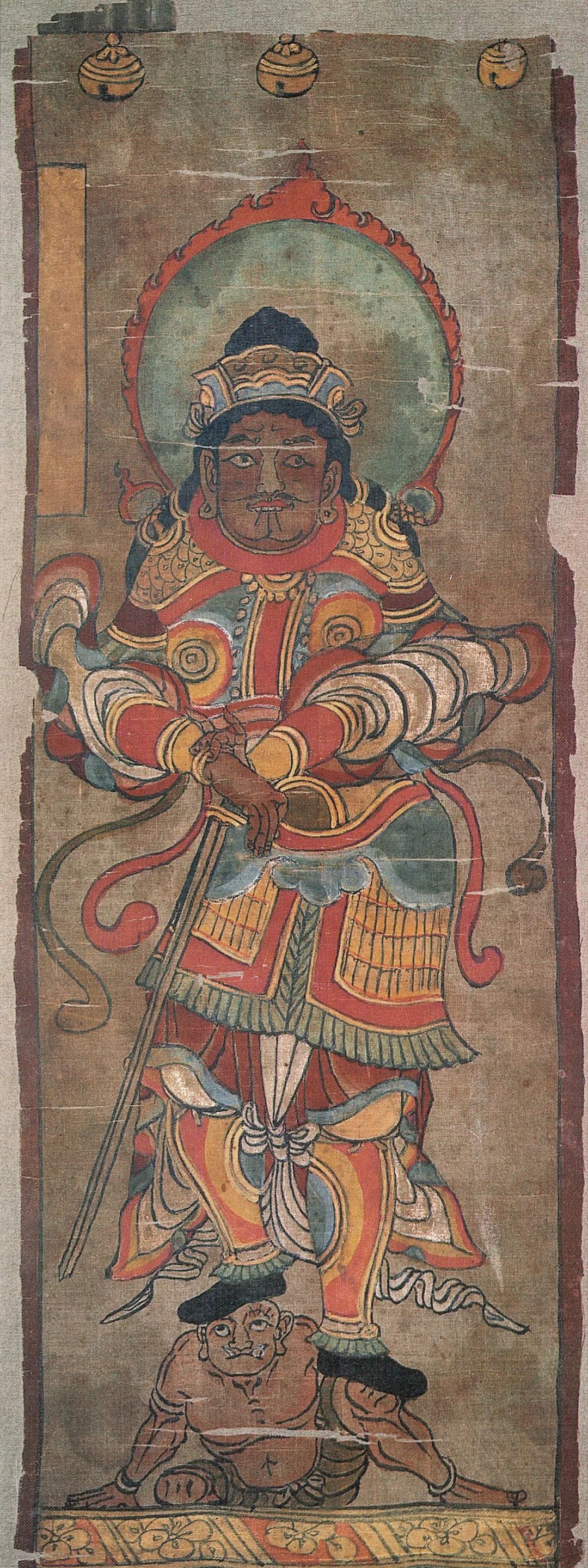 天王的画像多出自于幢幡,由于幡的主体幡身是一狭长的绢带,画面所限,因此呈现给观者的画像基本上是单独的立像。书中收录的两幅绢画《行道天王图》,是难得一睹的群像,虽然画幅不大,但给人的感觉却是场面壮阔,气魄非凡。描绘了北方多闻天王即毗沙门天王带领众随从,乘云渡海,巡查领地。