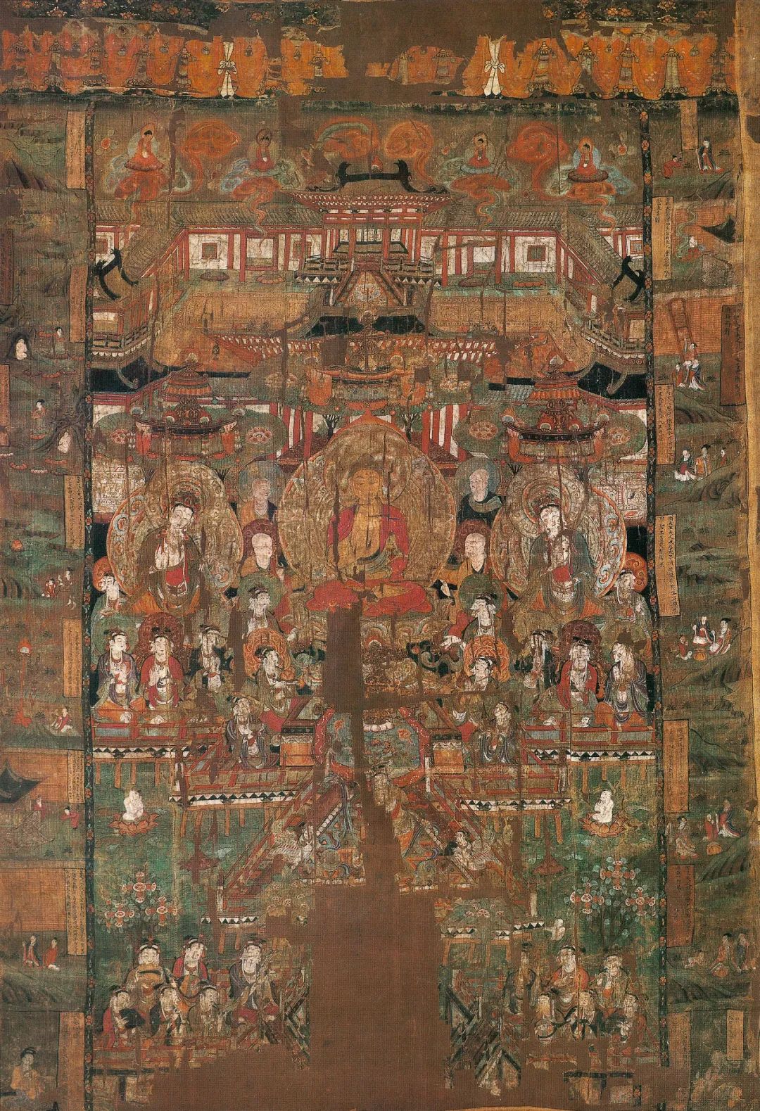 而狭义上的经变画,通常特指那些将某一部甚至某几部佛经之主要内容组织成首尾完整、主次分明的大画。古人绘制经变画的目的是运用艺术的形象,向信徒传播佛教的理念。