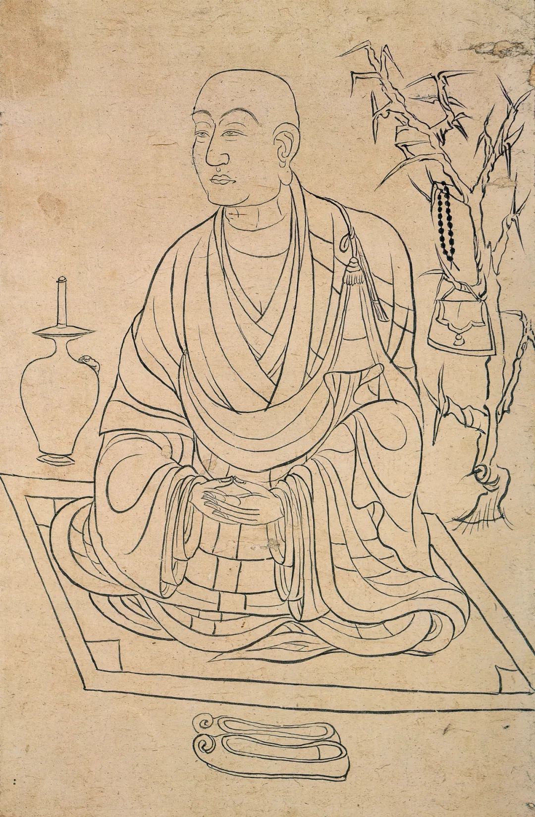 藏经洞纸本绘画中有一类特别的“写真”绘本。所谓“写真”像,即真人肖像画。如本册所收的《高僧像》便是代表。画中高僧跏趺坐于老树边的地毯上,树上挂着革袋、念珠,身前放着双履,身后放着水瓶。画中的人物表情安详沉静,双目炯炯,眉清目秀。墨线笔力劲健,潇洒自在,衣纹也描绘得非常精美。