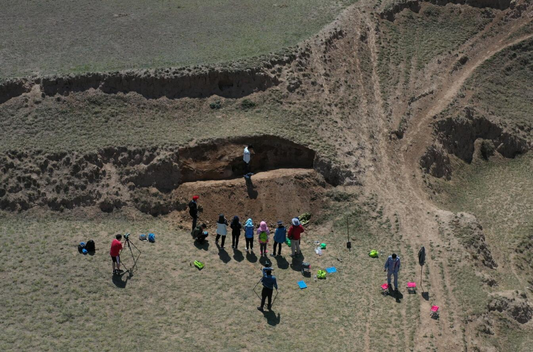 经过一下午的勘探,我们最终在台地西南部,观测点为39°48′46″N,113°28′12″E,高程为1169米的位置发现了遗址点。初步清理剖面,发现遗迹开口位于1层下,土色呈黄灰色,土质干燥致密,有块状堆积,堆积宽约3米,厚约68厘米,内含陶片,底部有带状红烧土堆积,厚约7厘米,打探孔时发现遗迹边缘距离剖面约1.2米,存在白灰面,暂定遗址性质为房址,编号为F1。遗迹点周围散落有绳纹、弦纹、素面灰陶片,羊趾骨(年代不定),发现青灰色磨制石凿一件。遗址判断为新石器时代遗址。