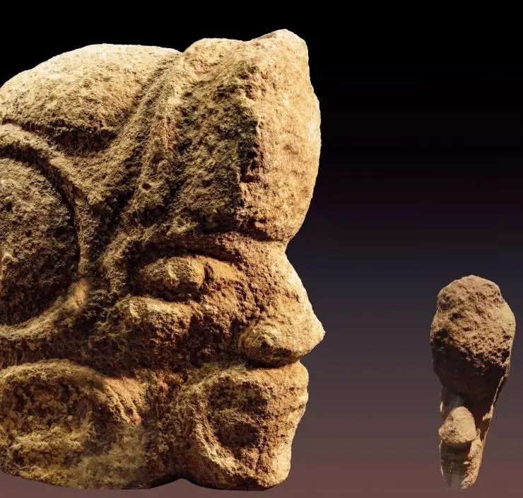 这个石雕人头像与若干风格及体量截然不同的石雕人像残片一同出土于辽宁朝阳半拉山遗址的神庙遗迹附近,推测这些石雕人像是被放置在5000年前的半拉山神庙旁边的。令人惊奇的是,这尊头像透露出许多耐人寻味的信息:额头上的突出物是什么?难道是一种面具?耳朵的部位仿佛盖着圆形的罩子,是否意味着当时天气寒冷,人们戴耳罩取暖?脖子的部位是竖着领子吗?石人表情肃穆,像是在参加一个庄严的仪式。虽然仅是头部,但是这尊石人像却让我们知道了生活在距今5000年前的红山人已经穿上了复杂样式的服装,有结构和功能复杂的头面饰物。他们的生活水平,远远超出了我们习惯性认知的范畴。