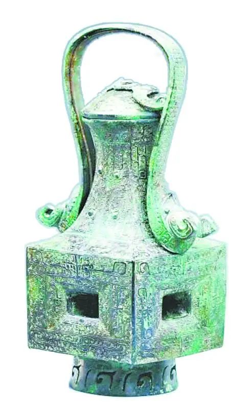 江西新干大洋洲商墓中曾出土过一件器形特别的“兽面纹提梁方腹铜卣(yǒu)”,与一般的卣不同,它的方腹下有十字形透空槽穴,腹内形成通向四壁的十字形管道。