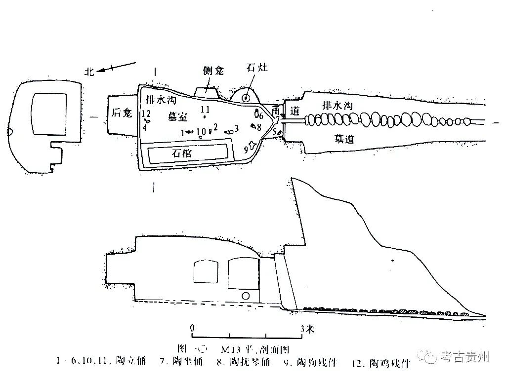 以M13为M13由墓道、甬道、墓室、后龛、石棺、石灶、排水沟等构成,墓顶呈弧形,整个墓葬长10余米。墓室是前窄后宽的不规则梯形,西侧的墓壁依岩凿了一个长方形的石棺,东壁前段凿有一个壁龛、一个灶。石棺和墓室周壁凿有水沟,上盖大鹅卵石,用于排水。