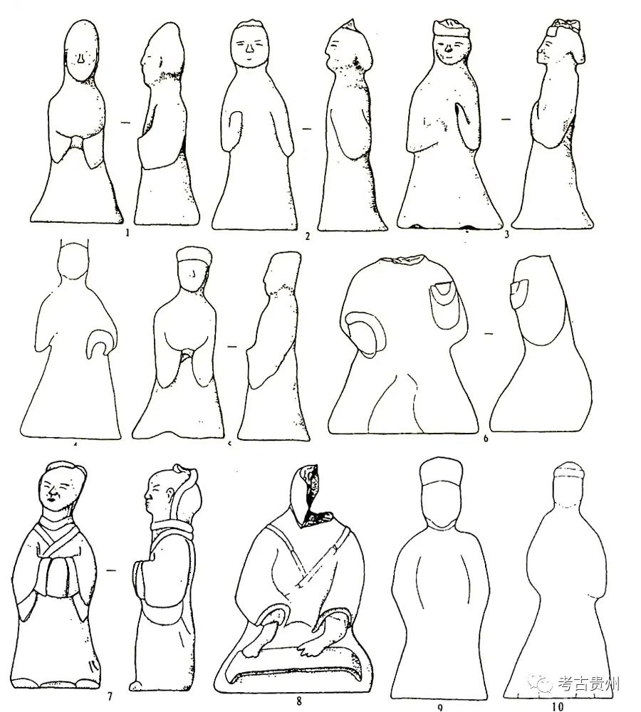 出土陶俑的陶质多是泥质,呈灰红色,有的是手捏,也有经过模子做好的。人物俑面部多已模糊不清。直立俑有19件、抚琴俑、跽坐俑各1件、另有鸡狗等动物形象。立俑共有19件。身穿长袍,站立,面部轮廓不清。