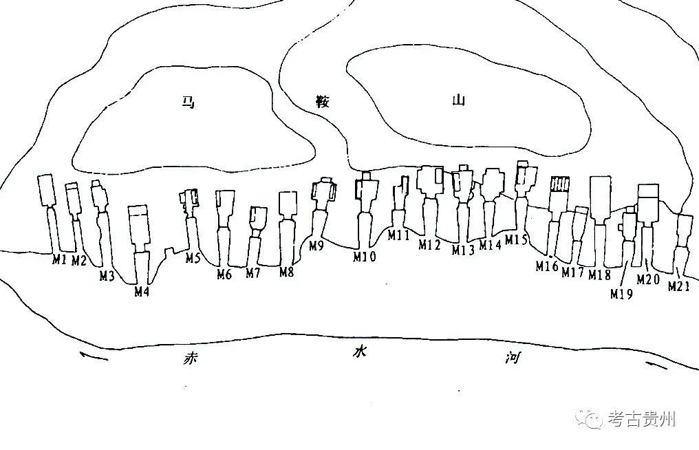马鞍山崖墓群开凿在赤水复兴镇镇西北西北约3公里的长江第二村民组寨前的马鞍山半山,南临赤水河。崖墓就开凿在马鞍山南侧东西长约80米范围的半山上,距河面高约10-15米。崖墓群共有墓葬21座,自西向东依次编号为M1-M21。
