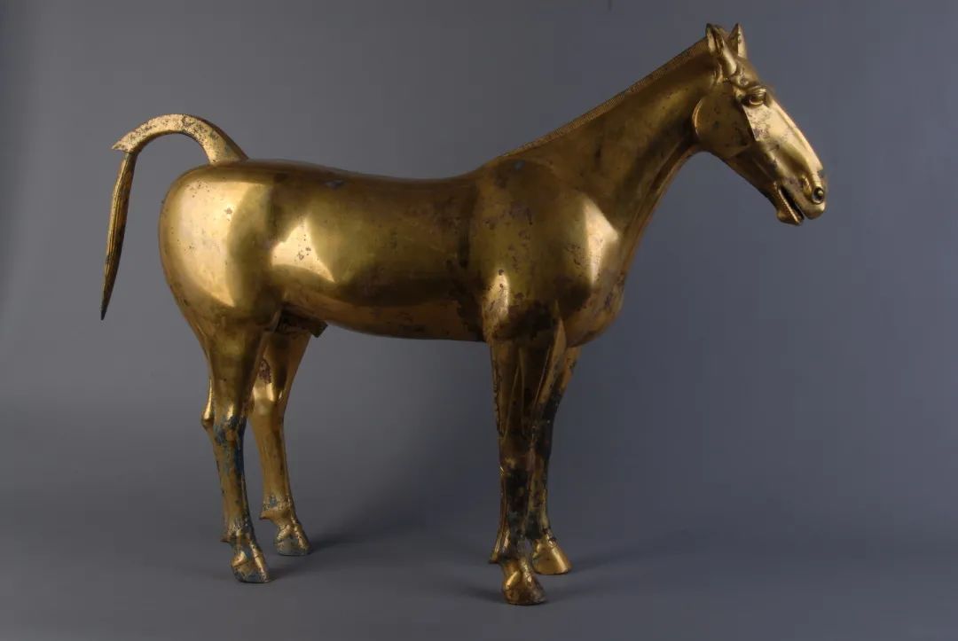 这尊鎏金铜马高62厘米,长76厘米,重26千克,它昂首翘尾,四腿直立,体态矫健。头部造型尤为生动,马嘴微张,牙齿外露,鼻孔硕大,双眼圆睁,两耳上竖,耳间、颈上刻有鬃毛。肌肉和骨骼的雕刻合乎解剖比例。马体匀称合度,马尾和生殖器是另铸铆接或焊接的,肛门有一小通气孔,造型朴实稳重。其身中空,静中含动,气度非凡,有一发千里之势,符合相马法中对良马特征的描述。