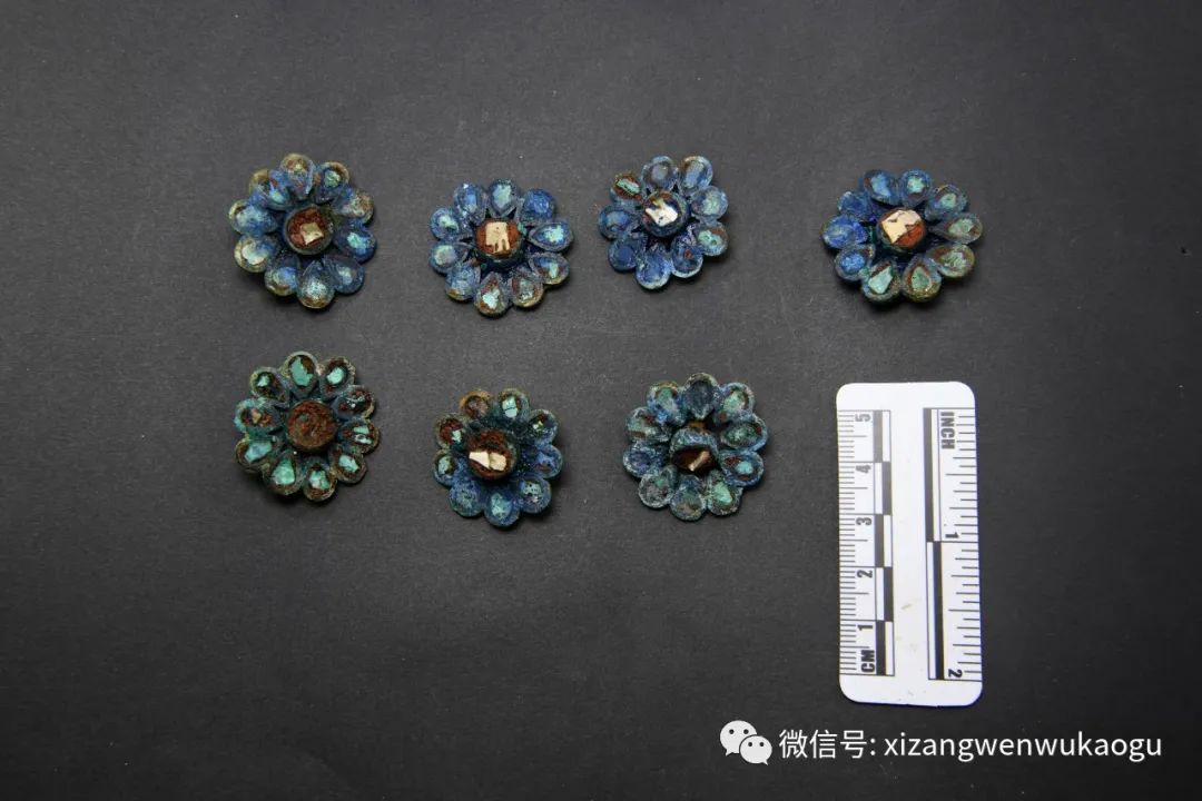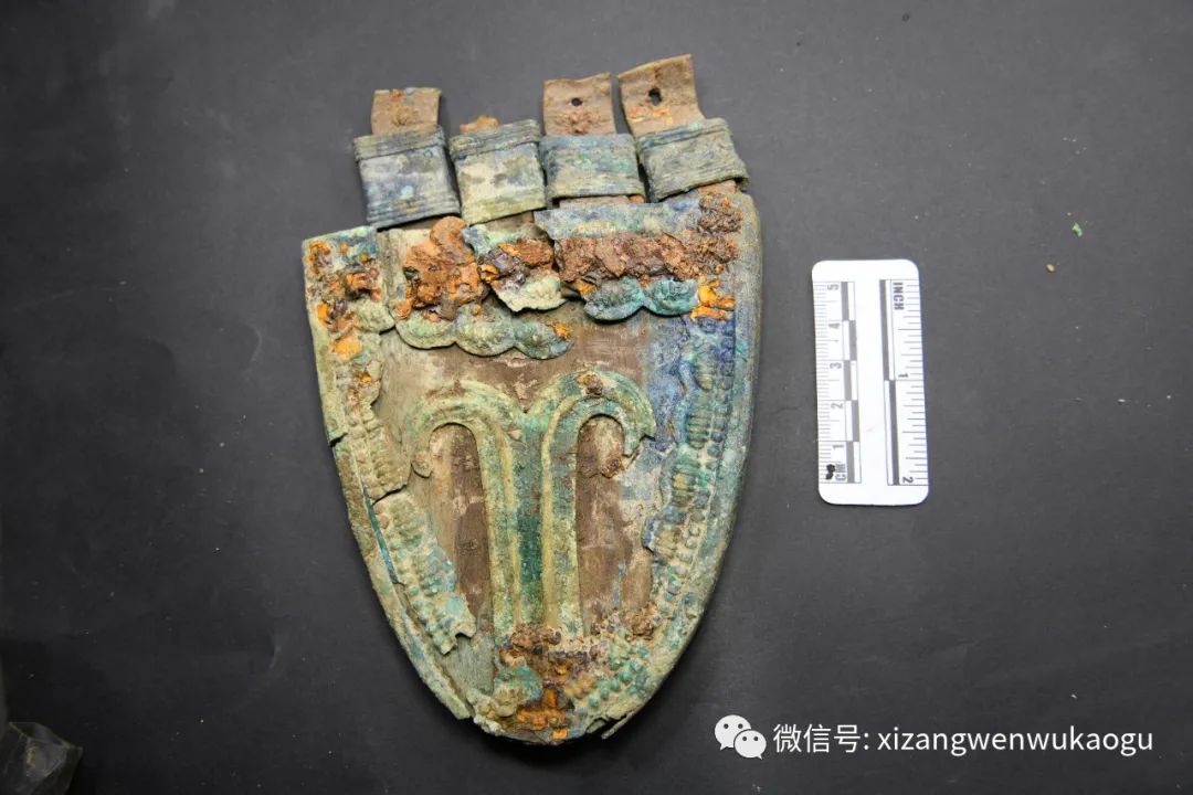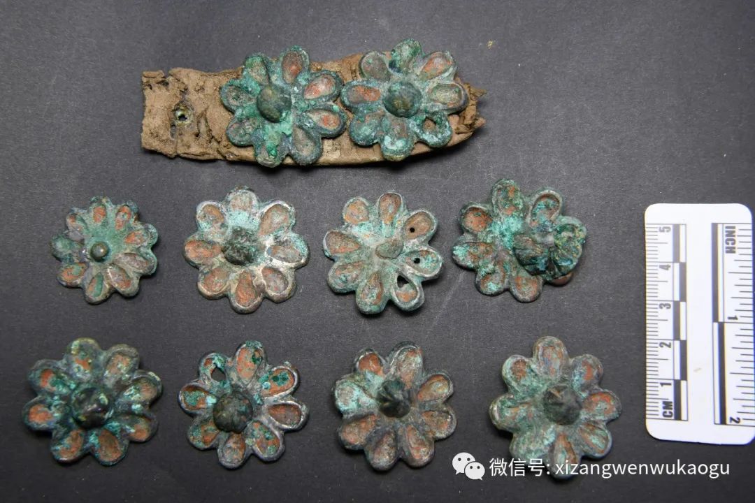 打包搬迁后,11月我们经过在山南市博物馆室内清理确认,墓葬为长方形竖穴土坑墓,以木棺作为葬具,棺顶垒石片封顶。木棺朽蚀严重,仅边缘木框残留有痕迹。木棺可分为东、西两部分,东侧葬墓主,西侧置随葬品,头向东。随葬品有纺织物、铜器、木器、铁器、料珠等遗物。2020LNM1 的碳十四测年结果为公元6-7世纪,是典型的吐蕃时期墓葬。墓葬内出土的一件完整冠饰,与该墓地早年出土的圆形金饰、弓状金耳坠、盘羊金饰、金戒指等遗物,共同为研究吐蕃首饰提供了宝贵的实物资料。