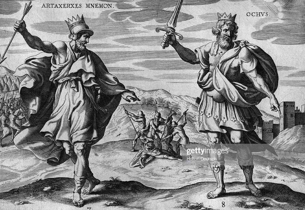 近代欧洲人笔下的 两位阿尔塔薛西斯大王年轻的奥克斯王子,就是在这样的背景下开始崭露头角。在父亲的统治生涯后期,他以统帅身份参与了失败的埃及再征服作战。在从尼罗河三角洲撤军的半途中,他听闻了父亲的死讯,以及腓尼基和塞浦路斯人也参与叛乱的消息。更让他恼火的是,先前还忙于自保的埃及人,已经派出舰队向所有叛乱者都送去了资金或希腊雇佣军。若不能采取铁腕手段弹压,那么波斯帝国的西部半壁将立即瓦解。