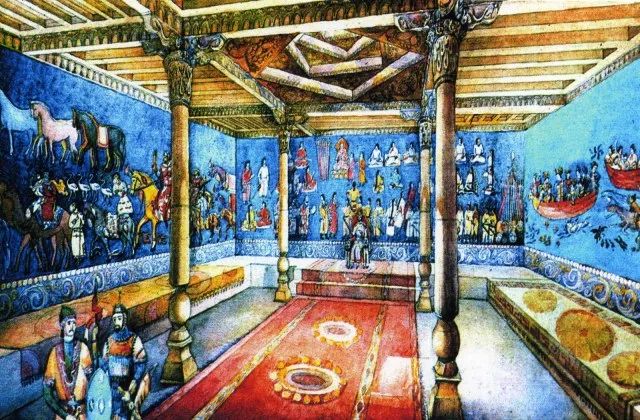 撒马尔罕宫殿的使者厅壁画也体现了当时流行的世界四大君主的概念,当时反应的四大王还是突厥可汗,唐朝天子,罗马皇帝和波斯国王