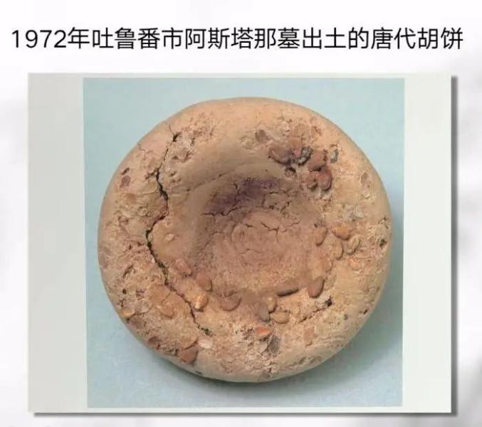 唐代胡饼化石,类似于现代的小馕,用小麦面制成,表面粘着的果仁粒粒饱满清晰