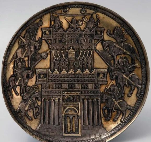 比如这件精致的银盘,就是粟特地区的涅斯托里派基督徒制作的,描绘的是耶利哥的陷落:妓女拉哈卜透过一扇门上方的窗户向外看,由此她让约书亚的间谍们进入了迦南城市耶利哥。在盘子中央,以色列人的约柜被高高举起,祭司们吹响号角。更远的地方,又一座迦南城被夺下。盘子的顶部装饰了太阳和月亮,依照约书亚的命令停滞在天上。